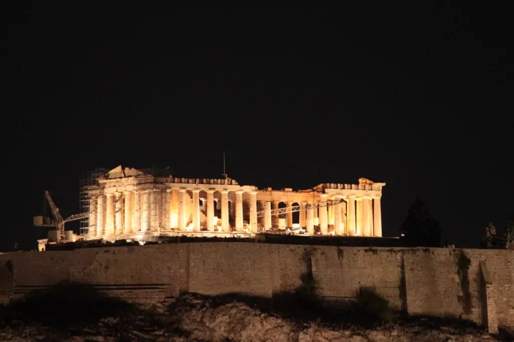 The hotel is nice and we got upgraded to a room with a view of the Acropolis and the Parthenon. We went to the lounge on our floor and took a few pictures of the Acropolis at night. Early evening for both of us.