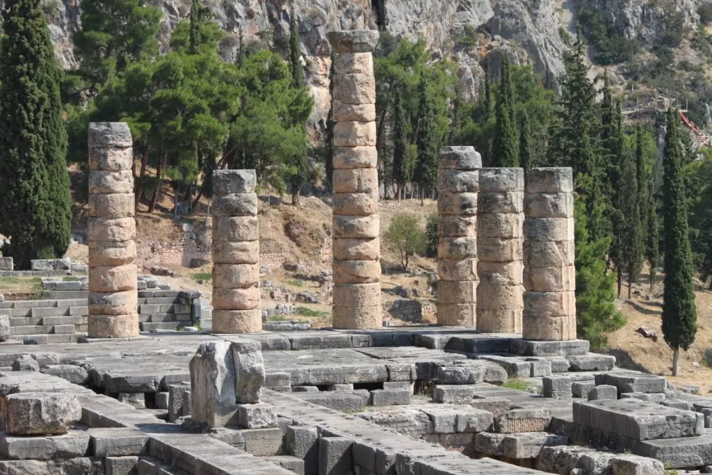 Delphi was an important religious site from at least 1600 B.C. to the 4th century A.D. My recollection/impression was that the Oracle was in a cave in the hillside, but I learned better. You may know that people would go there to get a glimpse of the future from the priestesses who would breathe in the vapors from the cave underground so they could hear what the gods were saying. What we learned was that the cave was underground but that the temple of Apollo was built over it. I had the idea that Delphi was a simple hole in the side of a hill leading into a cave and was I ever wrong. [That’s what I get from believing Homer.] Delphi is a big complex dedicated to Apollo. He, after stealing blood from the snake Python, had the ability to know the future. Zeus had determined that Delphi was the center of the world, and what better place to see the future.