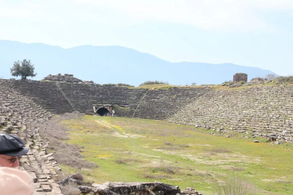 Hierapolis is very large in extent and there are many partially restored areas including a couple of early Christian churches. As in Smyrna, even though Hierapolis was Roman in its later days, the people were Greek and the inscriptions and the style of the statues were Greek. I’ll mention a couple more things for local color. One can still bathe in the hot springs and some people were doing that. They also have a “feature” called “doctor fish.” To experience this, you sit on a bench and put your feet in the water and fish nibble at them. It is supposed to be therapeutic. Needless to say, Patricia and I did not try either of those things.