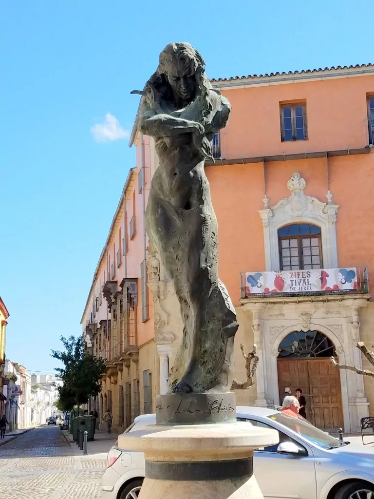 We only had one espactaculo scheduled for Wednesday. We saw Manuela Carpio’s show called “Al Compás Con Su Gente.” We had the same good seats at Teatro Villamarta as we did on Monday so we had a good view. This may have been the best show we have seen to date in Jerez. Her group had 12 people with multiple singers and guitar players, but she did all of the dancing. I probably should not say “all” of the dancing; from time to time, the cantaores would break out in flamenco steps but not so choreographed as regular dancers. Manuela Carpio’s dancing was tremendous. With lots of enthusiasm and emotion, the performance was engaging and stimulating. At the fin de fiesta (lit. “the end of the party” but think of it as the closing) everyone took a final turn of dance and song. I don’t know if it was part of the show or not, but as everyone in the theater stood up to applaud and as many bouquets were delivered to Manuela, the show’s director was in the corner of the stage trying to shoo all the performers off. I think no one wanted the evening to end.