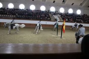 On Thursday, just before noon, fortified by tostas at the apartment, we walked to the equestrian school, which is literally across the street. The La Fundación Real Escuela Andaluza del Arte Ecuestre (The Royal Andalusian School of Equestrian Art Foundation) sounds old, but I was surprised to discover that it only dates back (officially) to 1973. It goal is to preserve tradition. One of the ways it does that is by training horses and riders and it demonstrates by putting on a show called “Cómo Bailan los Caballos Andaluces” (How the Andalusian Horses Dance). The show is a big tourist attraction. It was enjoyable, but not exciting. And, they were stinky about photographs, announcing in no fewer than 5 languages that photos were forbidden. Given all of the videos they were selling, I can see why they don’t want spectators to take their own. Thus, the photos I took—in defiance of the ban—are not well-composed.