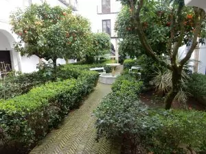 Monday was spent walking around in Seville. We explored places we had been before and found new places in Barrio Santa Cruz. Our apartment is in a building that sits next to a part of the old city wall and is a path for tourists. But it is not generally noisy in the apartment. The 4 floors (planchas) of apartments surround a nicely maintained courtyard and quiet fountain. Whenever the heavy wooden doors on the front of the building are opened tourists step up to the iron gate that blocks entrance and comment on the interior.