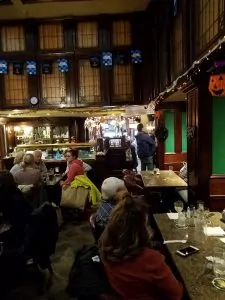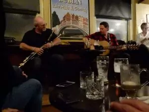 We went back to the hotel for a while before going out on a tour called “A Traditional Irish Pub Crawl” which sounds like it might be raucous. It was, but not because of the pub connotation; this pub crawl was all about traditional Irish music. “Traditional Irish music” is a) not folk music and b) is not Danny Boy or Molly Malone, as we were reminded several times. We visited three pubs and heard music in all three. Our “host” Brian and his companion, Owen, were true professionals with a deep understanding of the history of Ireland’s music and we learned a lot. They also thought they were funny and told a lot of bad jokes like “what do you call a guitarist with no girlfriend? Homeless.” The tour started in Temple Bar (hot tourist spot with some similarities to Bourbon Street in New Orleans) and finished off of O’Connell St across the River Liffey. We were greatly entertained and had a great time.