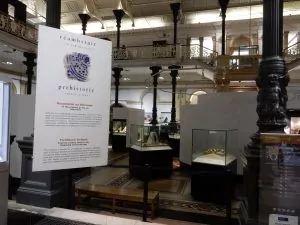 We walked from Trinity to the Archaeology museum, which is only a few minutes away. This is another place we will need to visit again. We barely started on the first floor, which has pieces dating back to more than 300, 000 years. Once again, the items were well-described and displayed. [At the museum, the captions are in both English and Irish.] there is a special exhibit on the first floor that showcases some of the gold and bronze treasure that has been recovered in the past 150 years or so. I did not even know that there were gold mines in Ireland until I just now checked.
