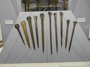 Most of what was on exhibit came from burials and discovered hoards. Some of the bronze and lithic pieces came from as far away as the Alps and the Baltic sea. There was too much to take in and we didn’t even get to all the rooms on the ground floor. One of the reasons we were interested in the Paleo items was that we just finished an archaeology class about the Southwest so we were prepared to compare the spear- and arrow-points and pottery (and other things) that were developed in Ireland with those developed in the Southwest. Those comparisons don’t work, of course, once metal-working gets beyond the copper age in Ireland.