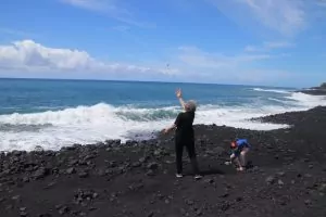 After we left the lava field, Kai took us to an old/new beach. “old/new?” Where the old beach was is now covered with lava that has created a new beach of a couple of hundred feet further into the sea. Kai said he used to surf at the old beach but it would be years before he thought the new beach would be ready for him. We did see a couple of surfers but they were far offshore because the waves break funny.