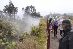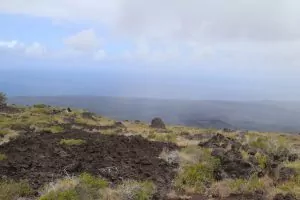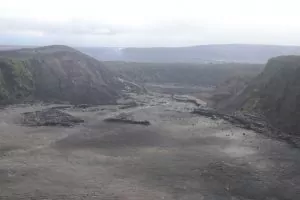 We drove to a second overlook and started hiking along the rim trail when, all of a sudden, the weather partially cleared. We were able to see across the crater and down to the bottom. The rain even stopped–for a while. Since last year’s eruptions ended, there isn’t any lava flowing, but the craters and the lava fields are impressive on their own. the park has good signage so we could see how old many of the flows are.