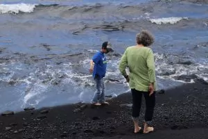 Friday morning we drove to Punalu`U Beach, a famous black sand beach. When we left Volcano Village, it was raining, overcast, and 62 degrees. 30 miles later (and mostly down the volcano’s slope) it was clear and in the high 80s. The beach really is more like small black rocks than all sand, but there is quite a bit of black sand.