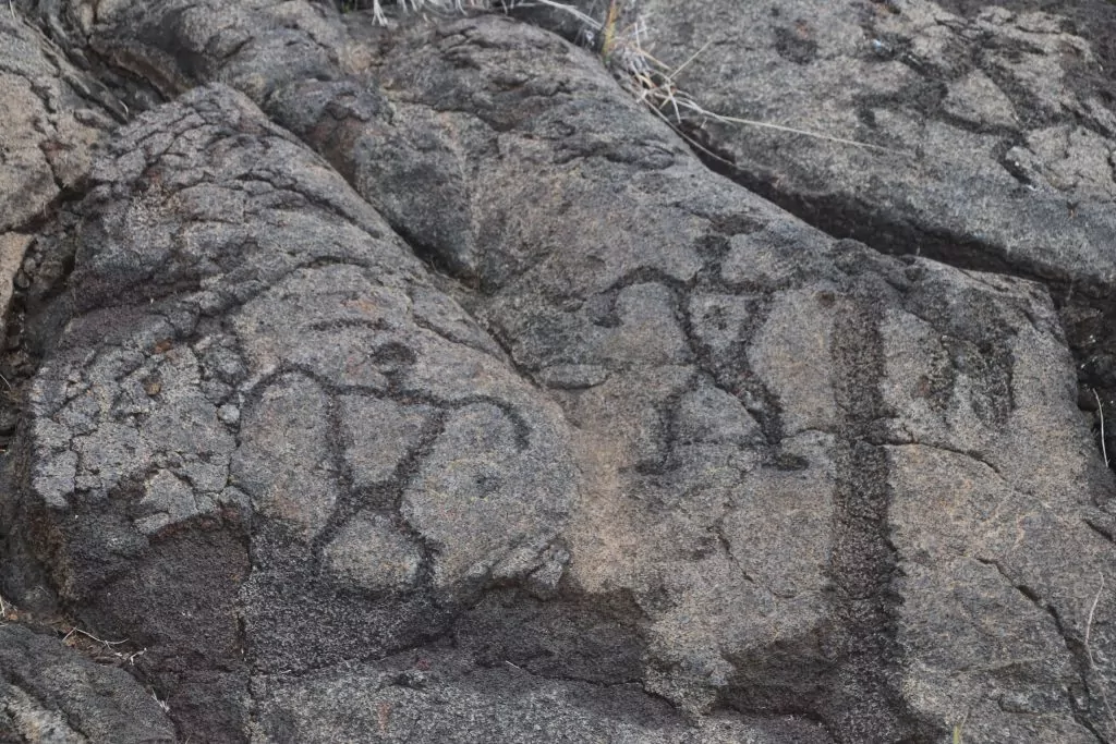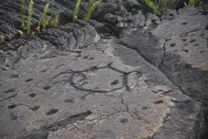 After a break at the house, we went back to the volcano park and drove almost to the end of the road, which took us close to the sea. So, again, we went from a high altitude to near sea level. The road was quite twisty. We stopped at a trail-head and hiked .7 mile to an area of the Pu`u Lua petroglyphs. The area is of great cultural significance to the Hawaiians and should be respected by everyone. The path there and back is over a lava field and is quite rough. Once again, Noah impressed us by making the trip with no complaints and without getting tired and being interested in everything he saw. In fact, Noah stopped at almost every cairn and added a rock.