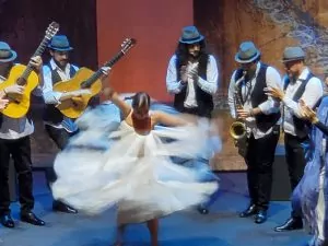 The espectáculo was organized around many different flamenco palos (song styles) such as Sombras, Farrucas, and Tangos. Much of the dance was balletic, but at the same time firmly grounded in traditional flamenco. The music was flawless and the tempo changes were well suited to the dance. Lighting was integral to the production as were the costumes. The combination of lighting and costumes added an extra dimension to the show. By this time of the week I have used up all my superlatives, but I should have kept some in reserve for this show. All of the performers, including Israel Fernández, who we heard just the night before, were outstanding, and were completely in sync with one another. Despite Sara Baras being the lead name in the show, she was not present in each segment unlike some other artists, who have to be center stage all the time. [I’m looking at you O. P.] But when she did dance, it was something to see. The audience responded enthusiastically throughout.