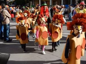 We were going to have a coffee with Amarita so we headed towards a place where we could sit outside. On the way there, the pedestrian walk was “obstructed” by a parade. It is Carnival (Carnaval de Cádiz) which is a big deal in this district of Spain. Here in Jerez, it was Children’s Carnival of Thursday. What we saw was a parade of children from a local school (or schools) dressed in costumes of all different sorts, themed by grade or class, marching to a small band and drummers. I’d guess there were at least a couple of hundred or more kids ranging from pre-school up to middle school. There were lots of parents accompanying the parade and most—but not all—of the kids seemed to be having a good time. Some of the youngest seemed a little bewildered by what was going on.
