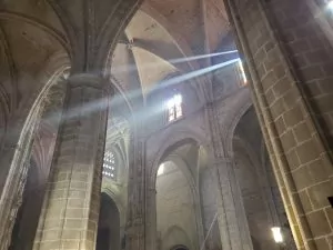 As it happened the light was streaming through the high stained glass in a way that created “beams” of light that showed up in the dusty interior. I was able to get some good pictures. This church was commissioned by Ferdinand and Isabella in 1484. We were in it a couple of years ago when the wind was blowing so hard that the interior doors opened and closed on their own and the wind created howling sounds in the roof. With the dark Gothic interior and the unusual sounds, it was almost spooky. But not today; the interior was bright and and we could see quite well.