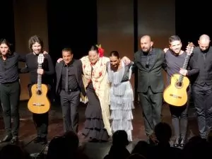 Now, about that next performance: we did not enjoy it at all. We should have lingered over desert and been late to the theater. The artist was Olga Pericet and the show was called “Un Cuerpo Infinito” (“An Infinite Body”). What we saw was Olga moving in time to weird music. My guess is that she was demonstrating the “music of the spheres” because she was moving around on a picture of the solar system placed on the stage floor. There was a little bit of flamenco, but not much. There were other odd scenes such as 3 people dressed in spacesuits who walked very slowly (as in low gravity) across the stage before removing the spacesuit and helmet from Olga.