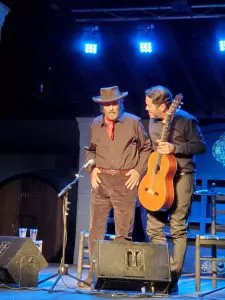 We walked over to Gonzalez Byass (Tío Pepe) for our midnight show. They have stopped giving away sherry, which was a small disappointment. Here we saw El Cabrero (Jose Dominguez) who was doing his final recital. Cabrero seemed frail as he made his way to the stage with help from a couple of people including his guitarist, Manuel Herrera. He sat in a wicker chair, mostly motionless, as he sang. His singing was strong and emotional and the audience responded equally strongly. I didn’t know it at the time, but el Cabrero (the goat herder) is and has been a protest singer and social activist. His enunciation was clear and he introduced each song with a few words. It was clear that the audience contained many fans who knew his work. During one song, there was loud applause for each verse and a standing ovation at the end. Even though we did not understand the lyrics (las letras) well it was clear that he connected to the people. It was, for us, a very real example of duende (a quality of passion and inspiration that doesn’t translate exactly).