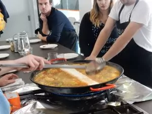 The main course was paella. We got good instruction on what paella was and where it came from originally—Valencia. We learned that “authentic” paella does not ever, ever, ever contain seafood. Dom was emphatic about this. However, I was surprised to learn that authentic paella (pie-a-ya) can include escargot. The meats can include chicken, rabbit, and duck. We used chicken. We learned how to prep the ingredients and then how to heat the large pan (from which paella gets its name). Managing the heat seems to be the name of the game in making paella. Dom showed us how to cut up the chicken. I didn’t try it, but Patricia says she learned something about how to cut up the drumstick.