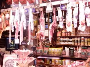 Inside the mercado is a cooking school called Taller Andaluz de Cocina (“Andalucía Cooking Shop” more or less). Today’s class was full with 15 students, mostly couples. The 3.5 hour class was given in English although a little Spanish was tossed around. The class began with a 45 minute walk through the market where our guide, Inez, stopped at several of the stalls to talk about locally produced food. I really didn’t grasp how varied the agriculture of Andalucía is until today. We learned about fruits and vegetables, legumes, cheeses (is cheese part of agriculture?), meats and so on? Did you know that the shape of a Spanish sausage tells you whether it is cured (straight shape) or un-cured (crudo, raw). I didn’t until today. We even talked about some of the spices that are produced in the area. There are, of course, product from other parts of Spain, but the focus at this market is on southern Spain. Because it was Monday, the fish stalls were closed: no fresh fish to sell.