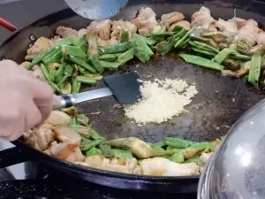 Then, the ingredients have to go in in a certain order and be kept in the right part of the pan to maintain proper cooking temperature. The chicken bones had been used to make stock and the stock has to be introduced into the pan at just the right rate. [“Just the right rate” and “just the right amount” seem to be cooking terms for “I don’t know. Just watch and learn.”]