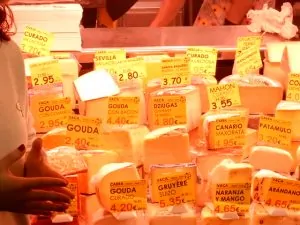 I arranged the class through airbnb, which now offers what they call “experiences.” This qualified. The course was taught in the Mercado de Abastos in Triana. “Abastos” are stalls where the usual kinds of fresh foods are found. There are more than 70 stalls at this market selling fruit, vegetables, meat, fish, flowers (OK, not a food), and wine (a food according to some). The market is right next to the Guadalquivir river where, many years ago, fishermen held a day market to sell the day’s catch. Gradually that turned into a permanent market and in the 1980s the new Triana Market, which is enclosed and covered, is a very busy place. It is busy not only with local shoppers and suppliers, but also with visitors (tourists) who clog up the aisles. A useful phrase to know is “Estoy buscando” (I am looking) to ward off stall keepers who want to sell you something.