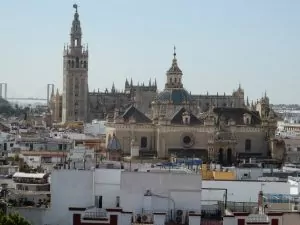 We climbed to the viewing area via a spiral walkway and when we got to the top we were treated to a unique view of Sevilla. It was a bright sunny morning and we could see everything. There was signage with pictures to tell us what we were looking at. We could see the residential rooftops with people hanging out laundry, the spires of churches dating back to the XI century, bridges, old and new buildings. It was a great perspective. At one point many of the church bells rang out simultaneously and I managed to get a video of that.