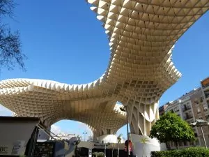 We had gone to the mushroom with the intention of visiting the archeological museum below the plaza. Seville dates back a long way, and when Plaza Encarnación was dug up to create the mushroom structure—which is very large—remains of a Roman area were found. That was preserved (largely) and turned into a museum under the mercado. The museum receives mixed reviews, with many reviews saying signage is terrible. We never found out. I got in the wrong line—not paying attention—bought a ticket, and was herded into an elevator and, to my surprise, the elevator went up, not down. Oh, no, I thought. Not up to the viewing area on top of the mushroom. Why would I spend money for something like that when I could go to a perfectly good museum.