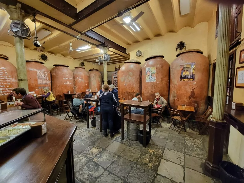 Here is a list of the places and foods on the tour: Bar El Comercio (Churros con chocolate), Casa Morales (Montadito de pringá, Tortilla de patatas), Productos de la Sierra (Charcutería and Cheeses) , Las Golondrinas (Champiñones con alioli, Pinchito moruno, Chipirones a la plancha), and Casa Cuesta (Espinacas con garbanzos, Salmorejo, Carrillada al PX).