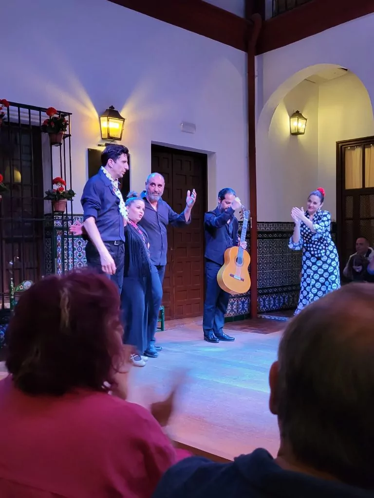 In the evening we had tickets for a flamenco performance at La Casa del Flamenco. The tickets said the show began at 7:00. But we went by the venue both yesterday and today, and the showbill outside said the show began at 7:30. I was willing to believe the time posted at the venue but by 6:40, Patricia insisted that we get there at 7:00 just in case. As usual, she was right. The show did begin at 7:00 and we got there with about 2 minutes to spare. We got 2 of the last 4 seats. The show was great and we enjoyed it. As an extra treat for us, one of the cantaores (singers) was Pepe de Pura, whom we just saw last week at a performance in Jerez.
