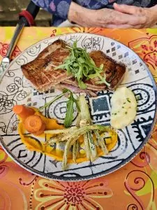 On Friday (happy March, by the way) we picked Bar Juanito, which is on Calle Pescaderia Viejo (Old Fish Shop Street, so we will stick with the Spanish version). We have been there before, but with a group, so our menu choices were different this time. We sat outside and even though there was no direct sunlight it was quite comfortable. Patricia had tuna prepared in two different ways and she liked both. I had albóndigas, which are meatballs prepared in a sherry sauce. It is one of the few tapas I really like. We are learning to linger over meals, but we still aren’t as good at it as the locals seem to be. Service was attentive and unobtrusive. We haven’t felt rushed at single meal on this trip. If you look at the picture above, it seems as if the tables on both sides are on the street. That is because they are. Foot traffic, bicycles, electric scooters, and delivery hand trucks all add to the ambiance.