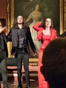 The early performance was at the Palacio de Villavivencio, which is one of the buildings inside the Jerez Alcázar. One of the first performances we saw in Jerzez, years ago, was at this venue. Then, we could not even figure out what line to stand in or how to find our seats. Now, we feel like old pros at the venues and hardly ever need any help—except when I go to the wrong level in Villamarta. The first show we saw here was a group of very well-known, fairly ancient cantaores (singers), some of whom had to be helped up to the stage. It was a great introduction to traditional flamenco cante by past masters. This time, we saw a new “master” Rocío Luna, a winner of the Lámpara Minera del Festival Internacional del Cante de las Minas de La Unión 2023 (trust me, a super big deal for a cantaora). She is very young, but she embodies the traditional styles like someone who has been living flamenco for years. Her guitarist, Jesús Rodiguez, really added to the performance. We enjoyed the performance immensely. Here are a few words from the synopsis: “This show, led by the young singer Rocío Luna, consists of a traditional flamenco recital that offers a journey through the different styles of Flamenco. During the performance, the palos known as “festeros” are intertwined with other rhythmic songs and some of a deeper character.” [Original here]
