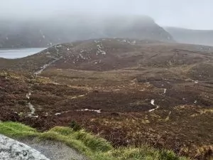 The drive to the Wicklow Mountains took us out of the city and the roads got smaller and more winding. We skipped the first stop because it was raining so hard. When we stopped for a coffee break, it was still raining. As we got into the mountains, heavy mist was added to the rain. I say when we got to the mountains, but we could only guess there were mountains because the mist generally limited visibility to about a hundred yards. We did stop at an overlook and the mist lifted enough that we could look down into a wide valley with a couple of fast flowing rivers with a lake in the distance. Of course, the rain did not let up.