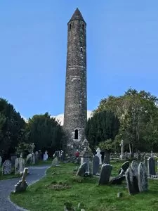 Now our progress was generally downhill. We stopped for lunch in a small place named Laragh and ate at a place called Lynhams where we had a good lunch. When we came outside after our [late] lunch, the skies had miraculously cleared. I suppose that is only fitting, because we were close to Glendalough, which is an ancient monastic settlement founded by St. Kevin in the 6th century. It thrived for centuries, despite being attacked by Vikings, the British (did I mention that Kevin has no mixed feelings about the British—forgive but don’t forget), and local Irish tribes.