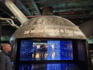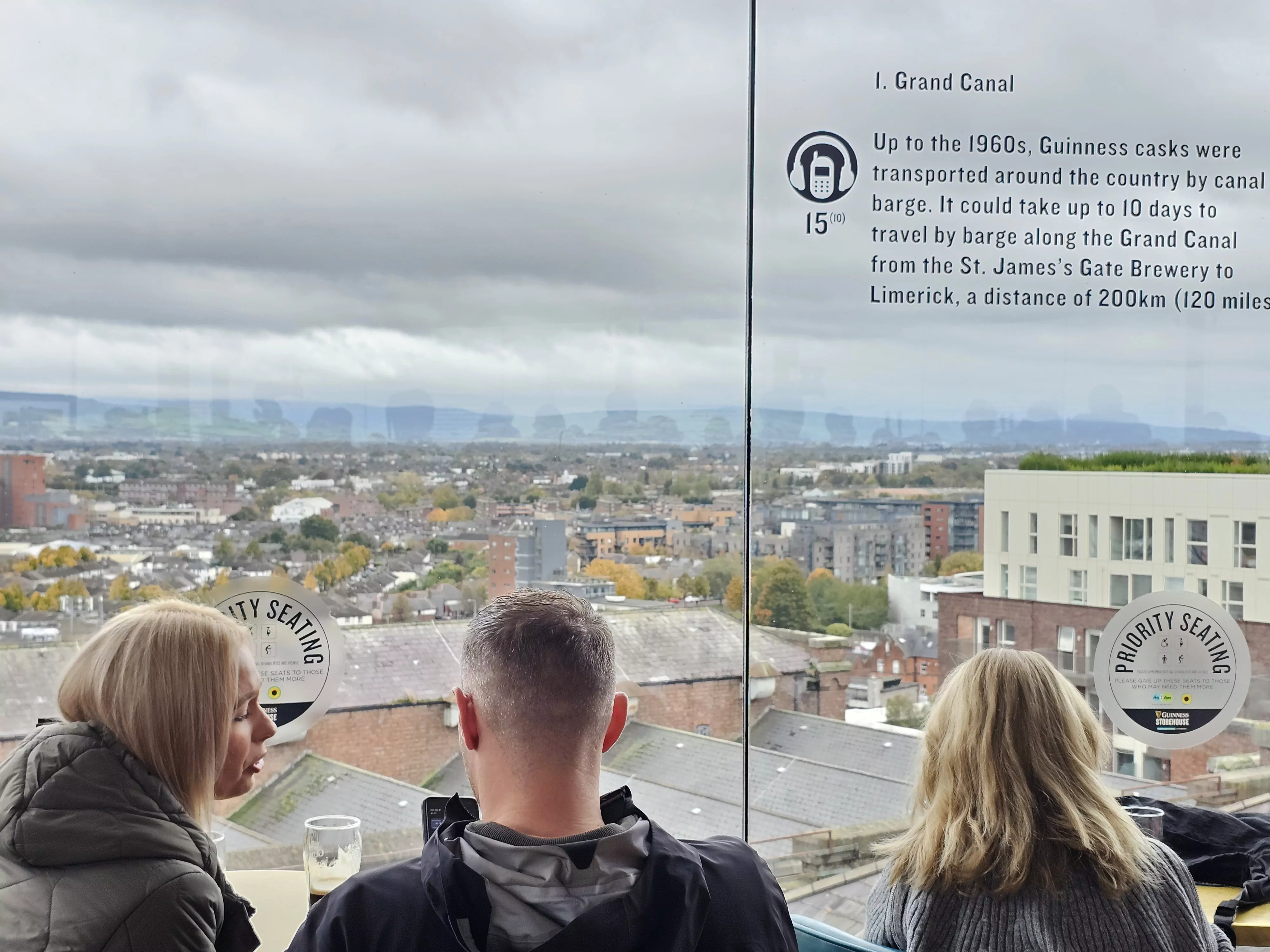 I may have already mentioned the brisk wind. It was not only brisk, it was also in our faces no matter which way we turned on our way to our next stop, the Guinness Storehouse. The Guinness Brewery was established in 1759 and has become iconic in Ireland and around the world. Guinness is now part of Irish culture and the Guinness family has been a philanthropic force for many years. Our walk took us about 20 minutes and we arrived early for our timed slot at 10:45. I thought we were going to have to wait outside in the cold and wind, but we were waved in as soon as we arrived.