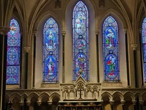 We took a short tour of the interior with a volunteer docent. She was so excited about all the information she had to share that she often had to stop and say “Wait, I forgot to tell you about …”. She did a good job of imparting small, relevant pieces of history about the architecture, monuments, and people connected with the church. What was supposed to be a 40-minute tour lasted 60 minutes. I took pictures of the stained glass, but like the stained glass at Christ Church, these windows date back only to the 1860s restoration time.