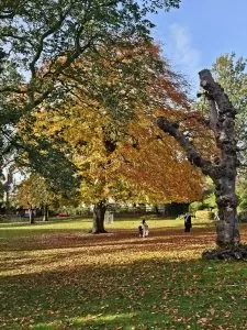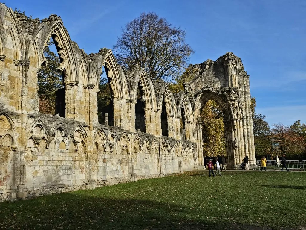 Our hotel is located about a 15-minute walk from the area around the Minster and that area includes the museum and its grounds. After our relatively short time in York we felt comfortable going back and forth. While it was cool, the sky was mostly cloud free and it was a pretty nice Fall day. We did not go in the Museum, but we did walk the Garden grounds. The ruins of St. Mary’s Abbey are on the Grounds. When I say ruins, I mean there is not much left. There are some upright walls, and some traces of the outlines of buildings dating back to the 11th century. Some of the Abbey was destroyed when Henry VIII’s troops looted it during the time known as the Dissolution of the Abbeys in around 1534. We enjoyed our walk around the colorful (Or colourful, since we are in England) grounds. The grass is still very green, but the trees have lost a lot of their leaves.