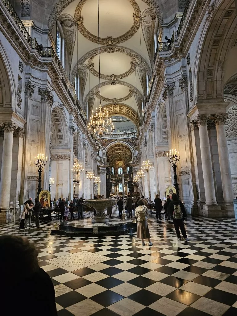 This morning, the 31st, we had tickets to visit St. Paul’s Cathedral. The temperature was not bad when we left—about 58 degrees—but the sky was threatening. There is a Tube station right around the corner from the hotel so getting to the Cathedral was no problem. In central London, it is often far better to deal with the Tube than to walk or take a taxi because the sidewalks and streets are clogged with people and cars (no cars on the sidewalks, of course). When we entered the Cathedral, the ticket taker looked at the codes I had on my phone and said that he had never seen tickets like that. I was able to show him the original purchase, and he admitted that this was the first week of using their new entrance system, so we both learned something.