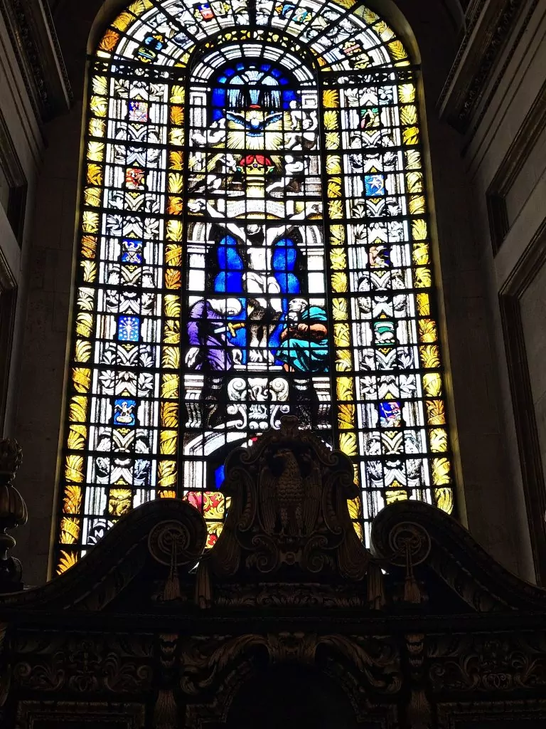 I mentioned there are only three stained glass windows in the cathedral. They are all at the east end of the church in the American Chapel. This chapel is dedicated to the 28,000 American soldiers who were stationed in England and lost their lives in the Second World War. The three windows have symbols of the 48 (at the time) U.S. states, arranged in order of their acceptance. He took time to point out some of his favorites.