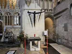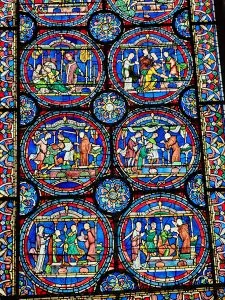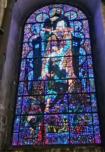 Given how old the cathedral is, it is not surprising that there is stained glass from many periods in the church. Philippa told us about several of window. For example, she told us about the “story” windows which lined the north wall along which the pilgrims queued when visiting the shrine. The stories show how miracles cured various afflictions. She asked if we could guess what the “green box” we saw in most of the scenes was and I suggested it was a donation box. She said that it was used as a not-so-subtle reminder to the pilgrims that they should contribute if they expected a miracle.
