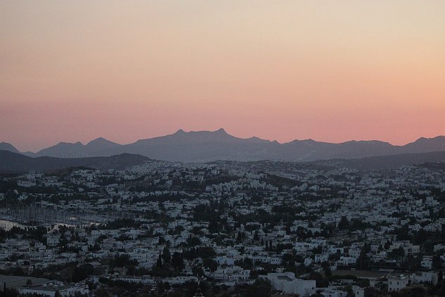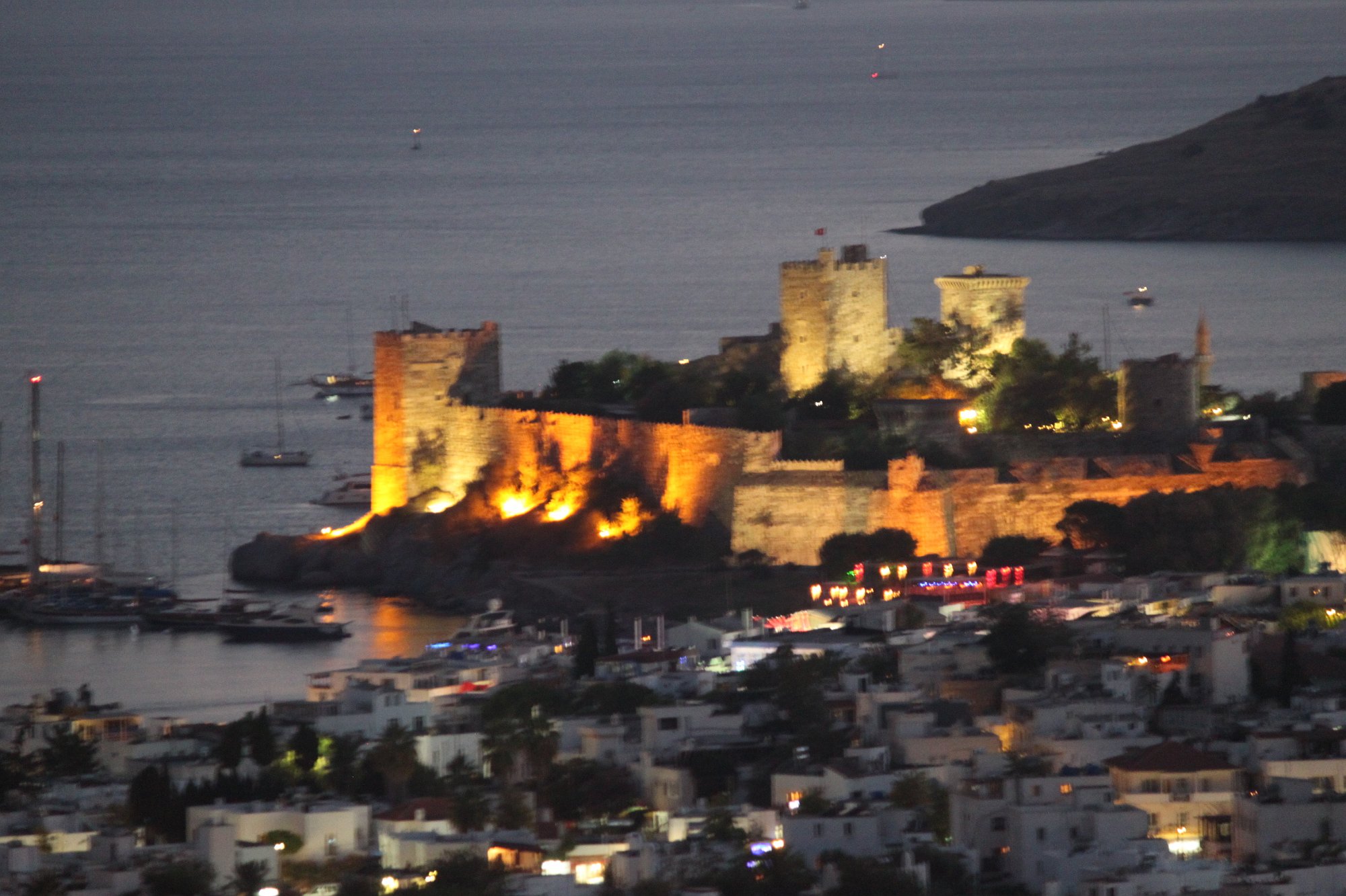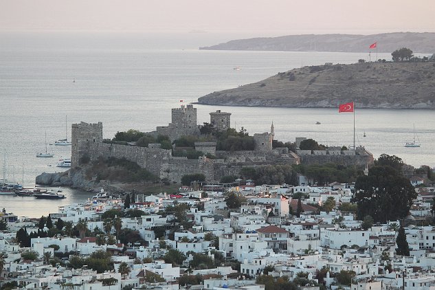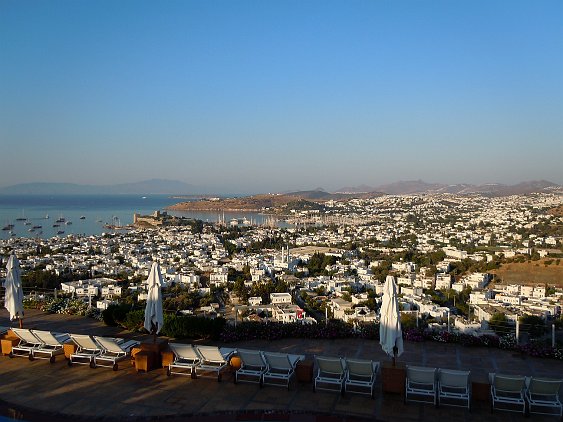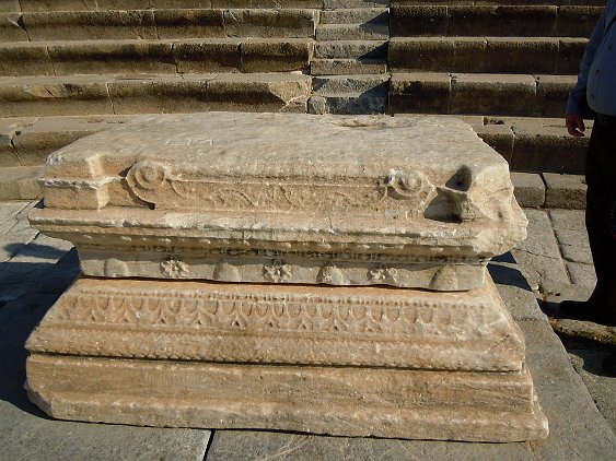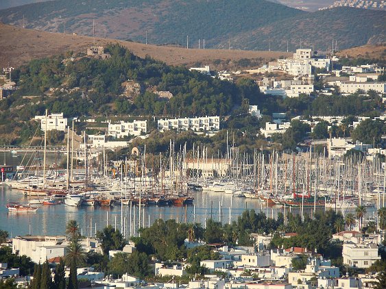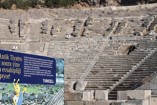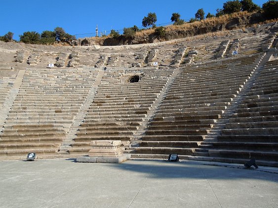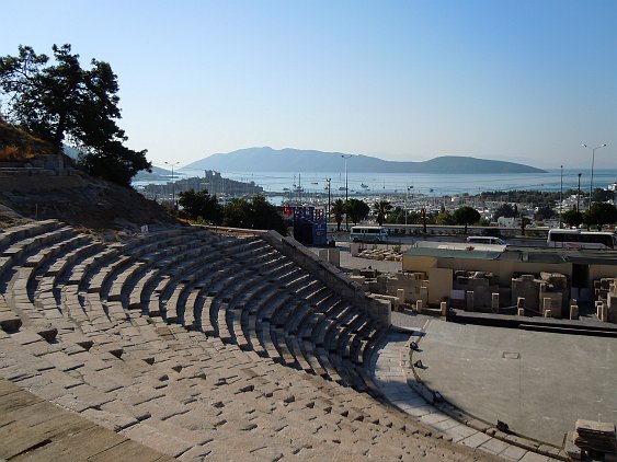 This view of St. Peter castle is from the outdoor restaurant at our hotel. You may safely infer that it was a great location. For some reason, this view reminded me of the fairy chimneys in Cappadocia. Sunset on our first evening in Bodrum. Just after sunset. St. Peter Castle in the early evening Morning view of Bodrum from the terrace of our hotel. We ate all of our meals here at the outdoor dining area. This is a popular harbor. One of the two large mosques we could see from the hotel. We will visit the castle later... We might as well be in Arizona or New Mexico based on this vegetation. Getting ready to leave on our tour. As formal as the entrance looks, we found the staff to be very pleasant and helpful. You don't need to be able to read much Turkish to see that this is a very old Greek theatre. It is right beside the road. On-going reconstruction Standing on the procenium (proskēnion) and looking at the steeply angled seating area. I wonder how different the view was 2000 years ago fromthese seats? CappadociaEphesus