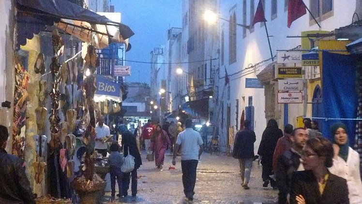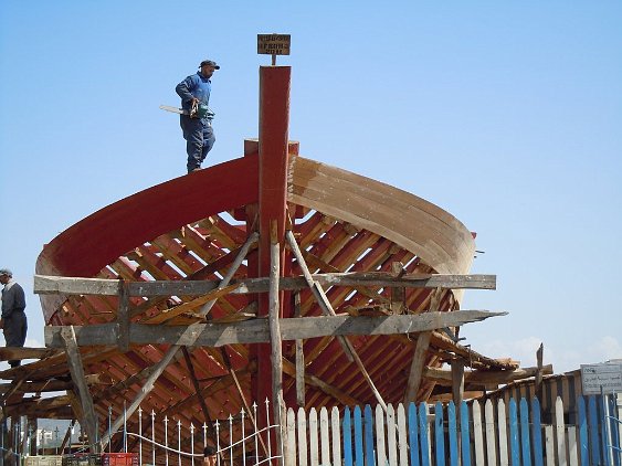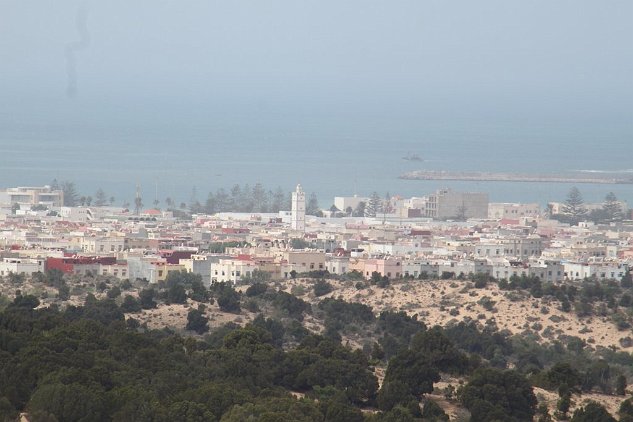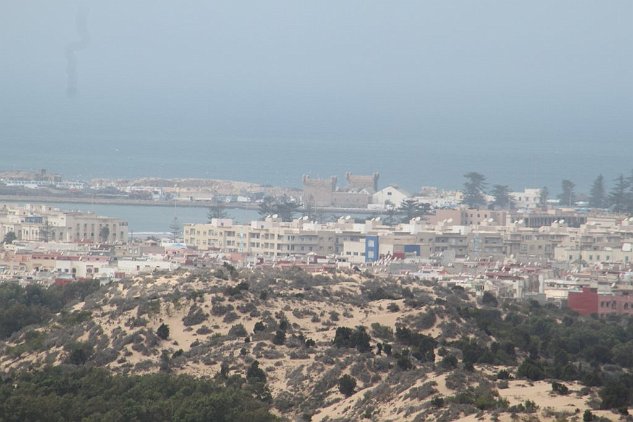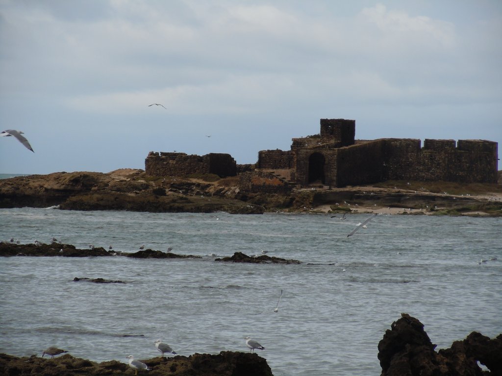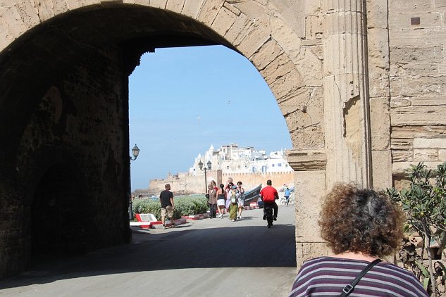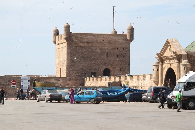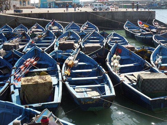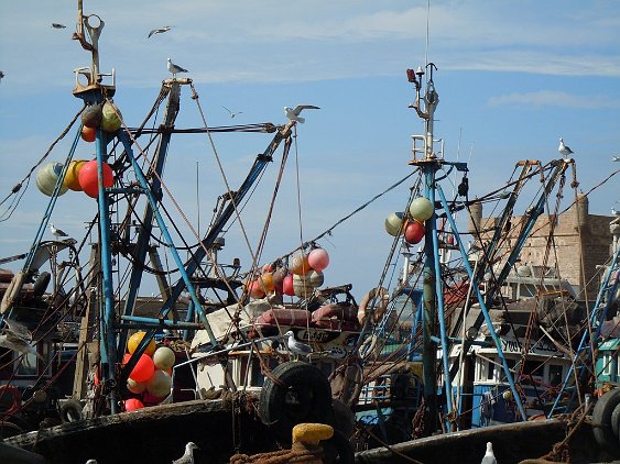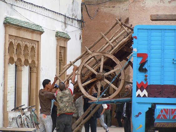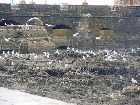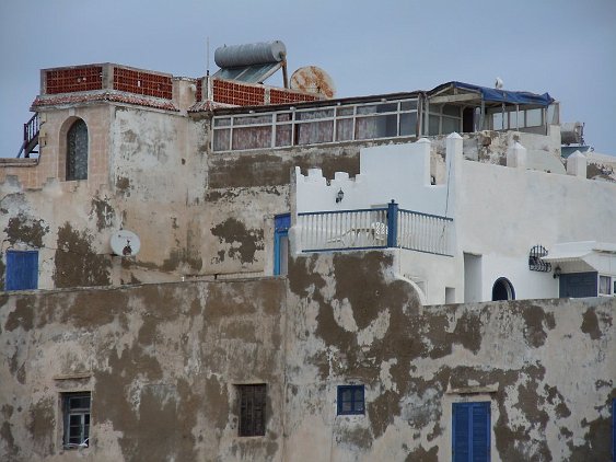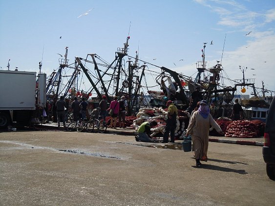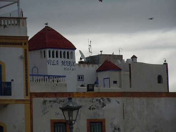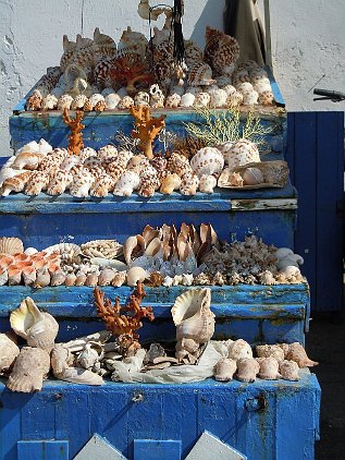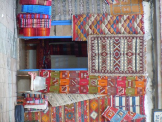 Essaouira from a viewpoint south and east of the city. You can see the harbor and the castle. A slightly different perspective from the viewpoint outside of Essaouira. Part of the defensive wall From inside the walls in one of the great squares Fishing is important and the harbor is full of workng boats. You can see some net repair and lots of sea birds This boat is much larger than most of the small fishing craft. These are some of the smaller fishing boats. Fishing nets and floats These are the middle-sized fishing boats You can see the defensive sea wall through this gate Shells and coral for sale Note the Star of Davis in this decoration above a door in the old part of the city. Mogodor island. You can wakl to it when the tide is out. There were a lot of sea gulls Being this close to the sea is tough on the buildings Here is where we stayed. From the garden on the top it was easy to see most of the old town and the sea. As with the other places we visited, there was a lot of color in the shops. Patricia could barely watch as these men manhandled this cart from the back of a truck into a museum. Nighttime in the medina. We found a good restaurant right around here. High AtlasLisbon