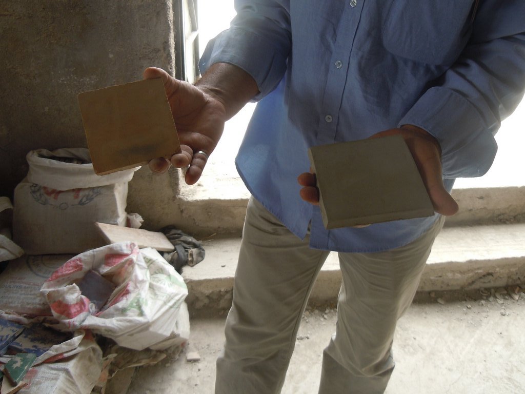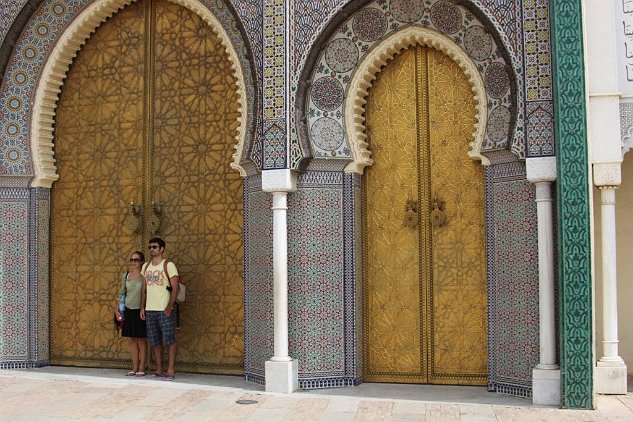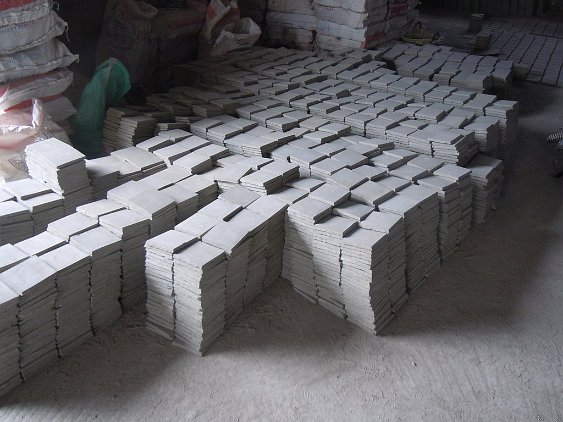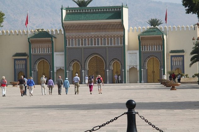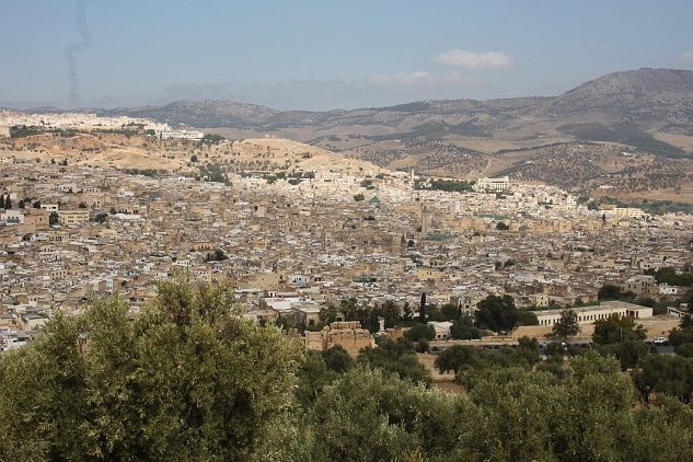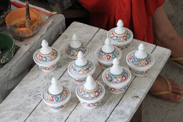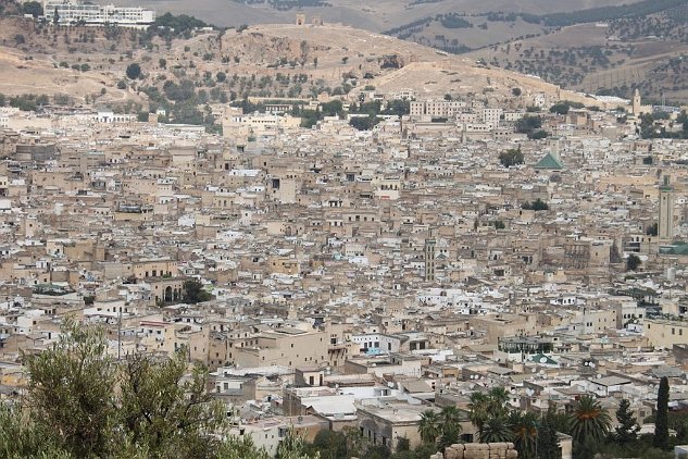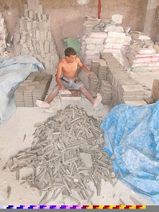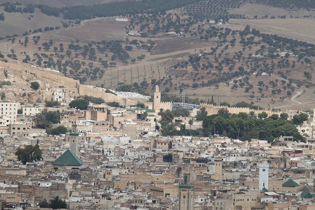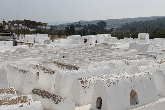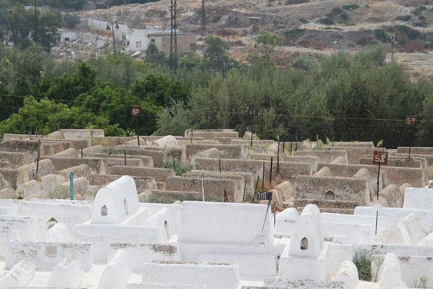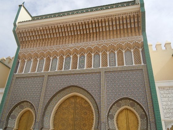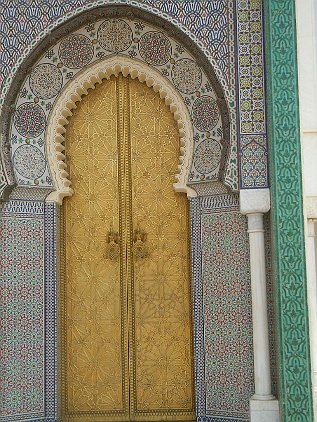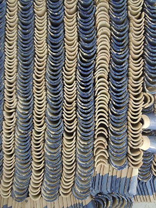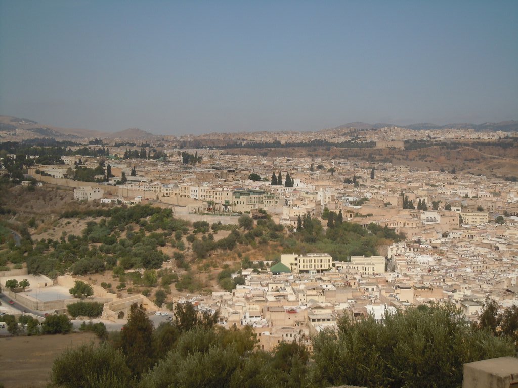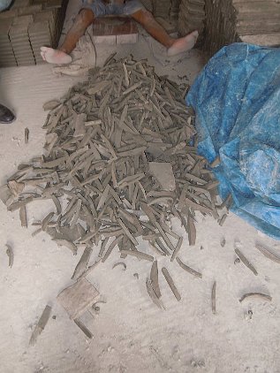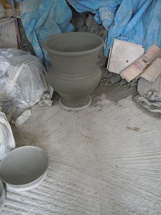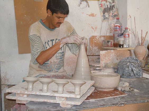 Fes--and another Royal palace Detail of the entrance to the palace Look at the full sized version of this image to see all of the detail The scale of the doors Jewish cemetery in Fez One of the oldest tombs is from 1600 A view of the old part of Fes It looks pretty crowded from here Part of the old city wall of Fes We visited a ceramics factory; this is some of the clay they use Clay formed into tiles Trimmings from the process Much of the work in this co-op is doone by hand with old tools tiles stacked for later use Before and after firing Roof tiles A clay pot under construction This man didn't even use a potter's wheel The painting is all done by hand MeknesMarrakech