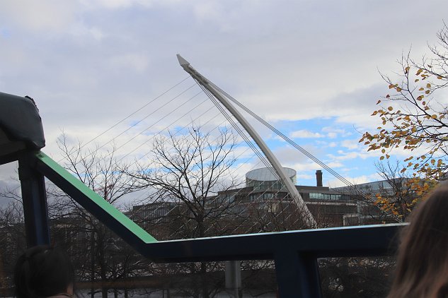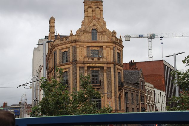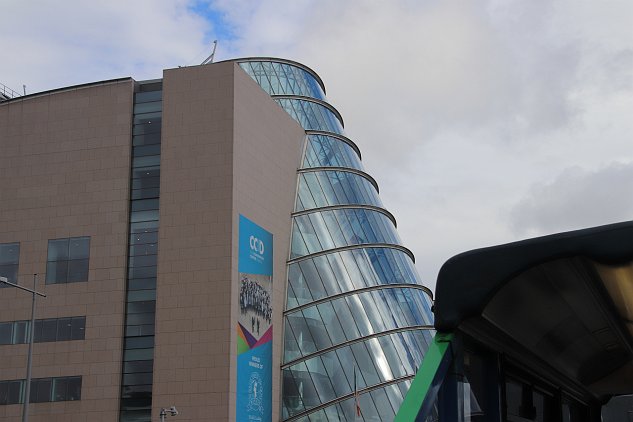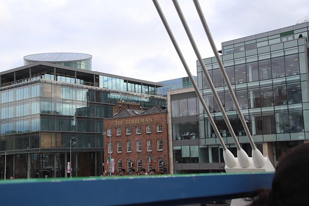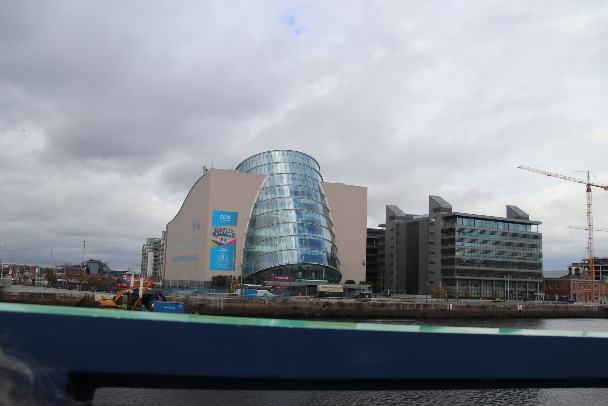 Built on reclaimed harbor land, this building has fallen over. [no, it hasn't.] It is in the redevelopment area near the River Liffey.
