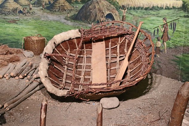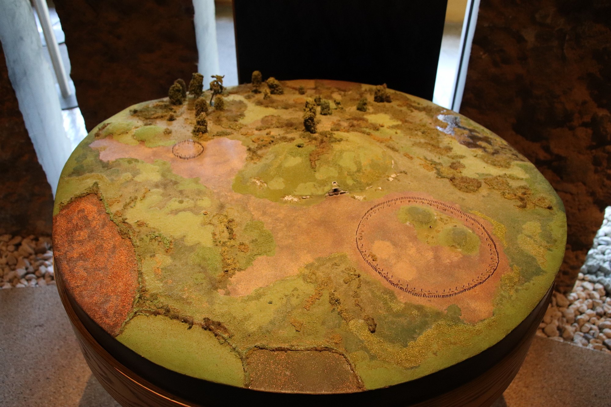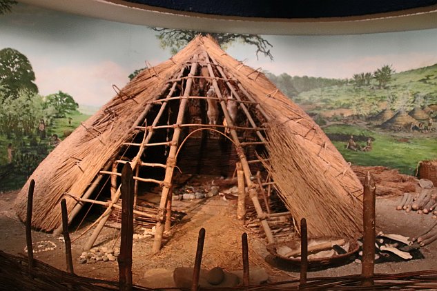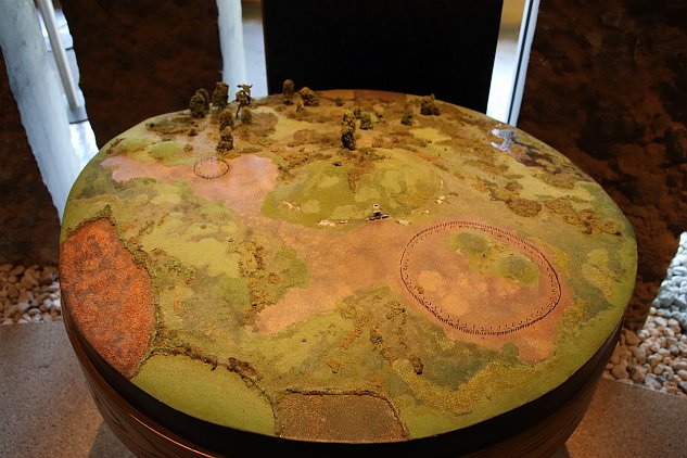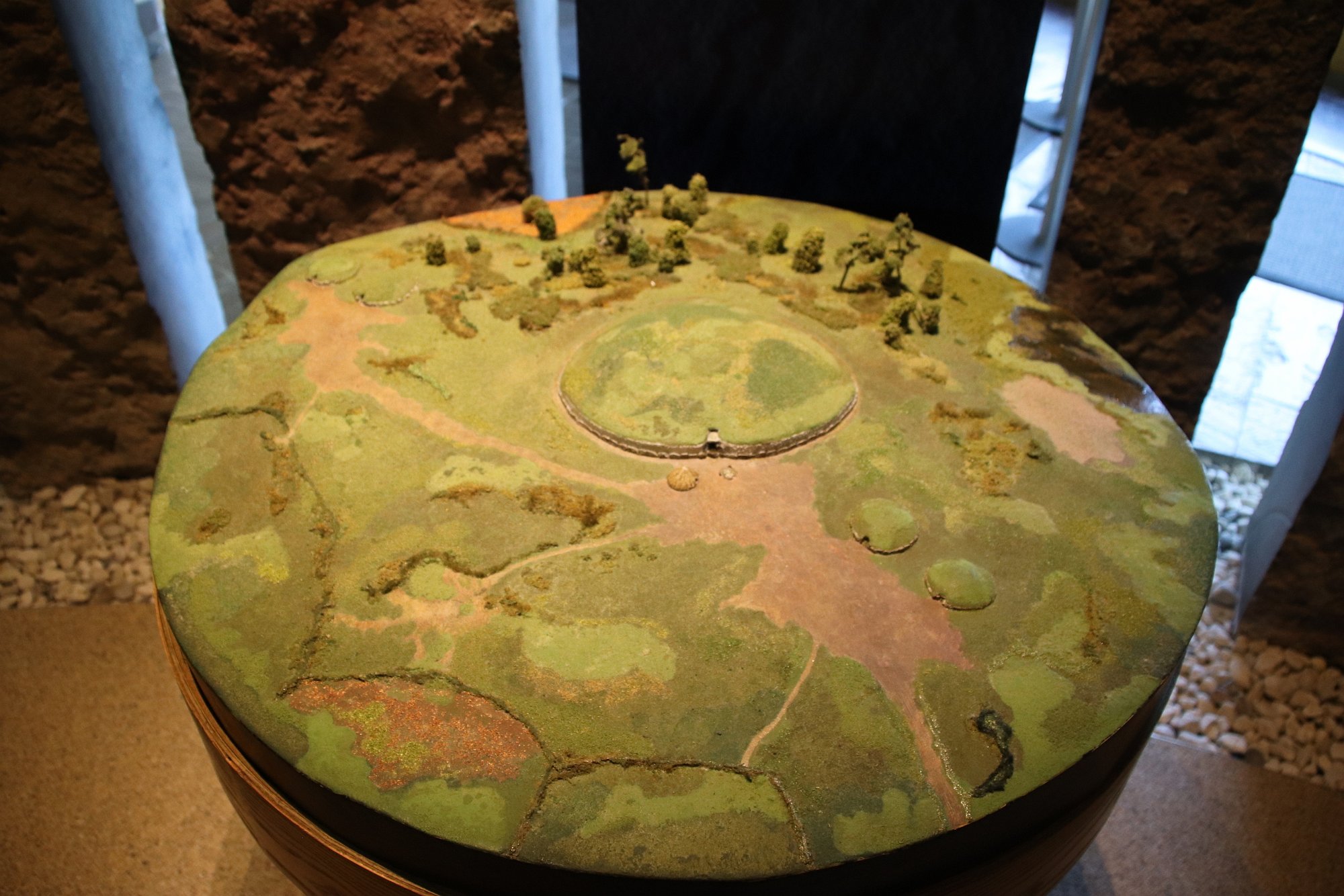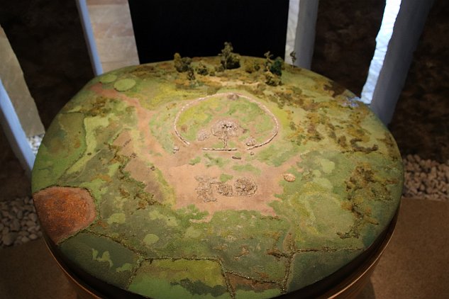 Inside the palisade, at the 12 o'clock position you can see a dark green circular area. Today, it looks like that circle has been reconstructed at the site.
