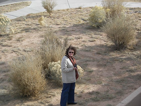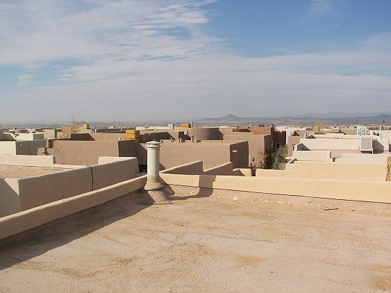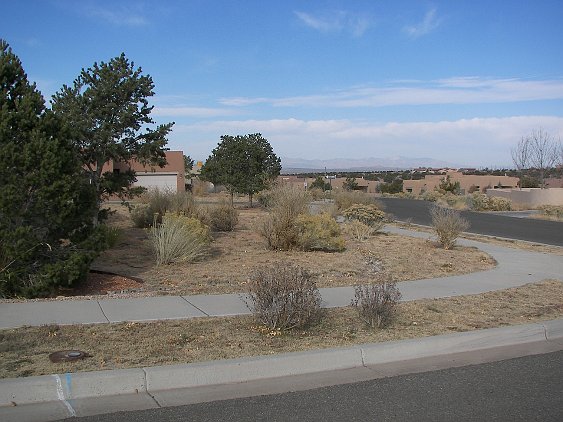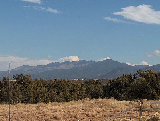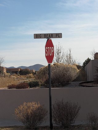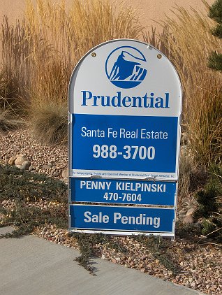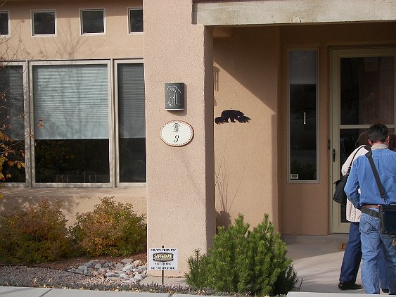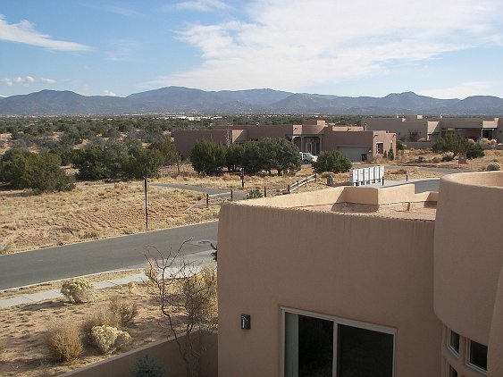 The view of the Sangre de Christo mountains from the North patio Common space next to our house There is an extensive trail system around the development. This entrance to it is across the street from us. Soon this should say "sold." A view from the side--looking Southwest Another side view towards the Southeast (more or less) The entrance way. Click 'here' to get a Google Map of 3 Big Bear Place It is clearly Fall. Patricia and the home inspector are getting ready to go in. 3 Big Bear Place Only one of the bears is "big." From the roof, looking mostly South. From the roof, looking North-East toward the Sangre de Christo mountains Looking mostly North, with Santa Fe Community College in the background. Patricia is looking forward to the seasonal changes in the vegetation. Light inside the front door--Patricia says it will have to go The living room. None of the furniture stays. This will be our office The family room October Visit