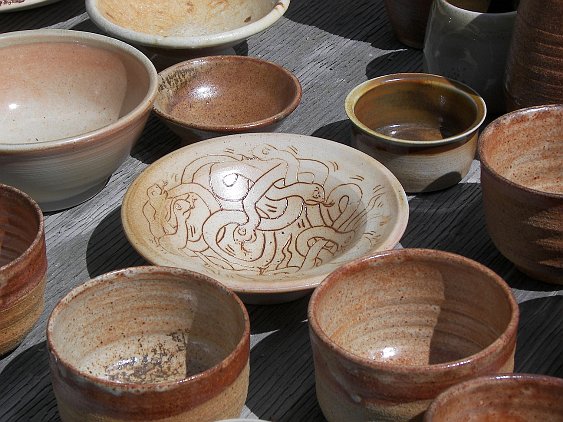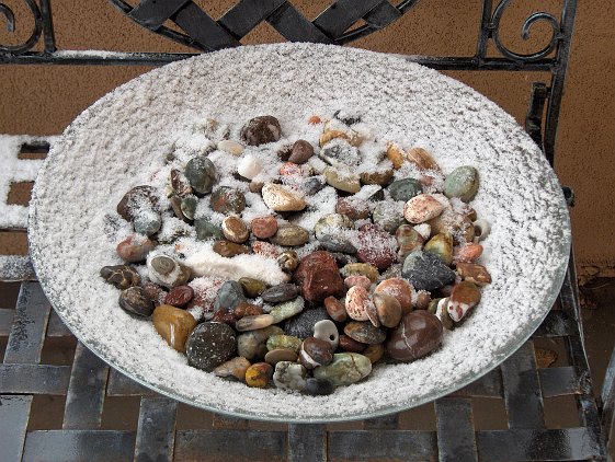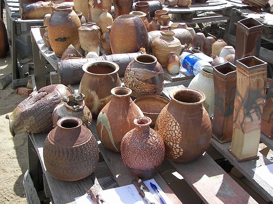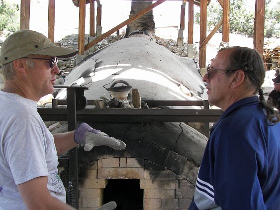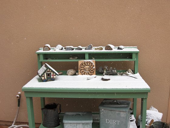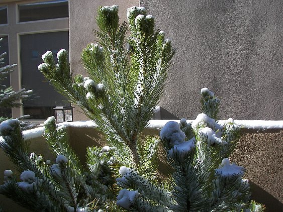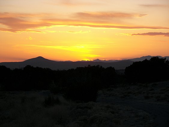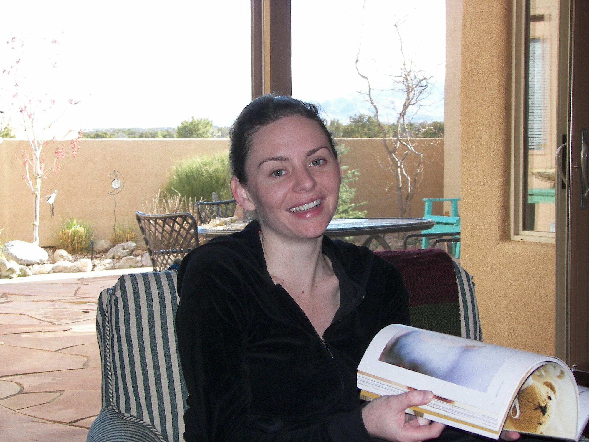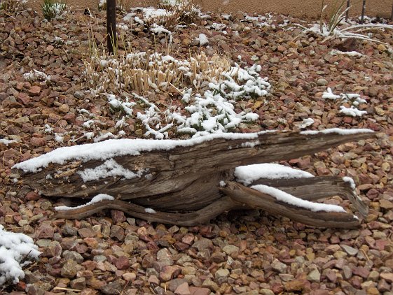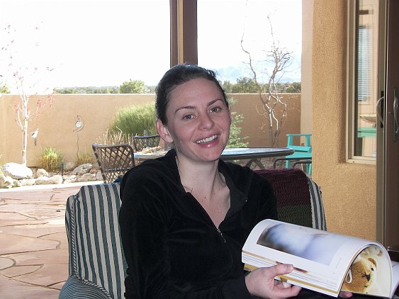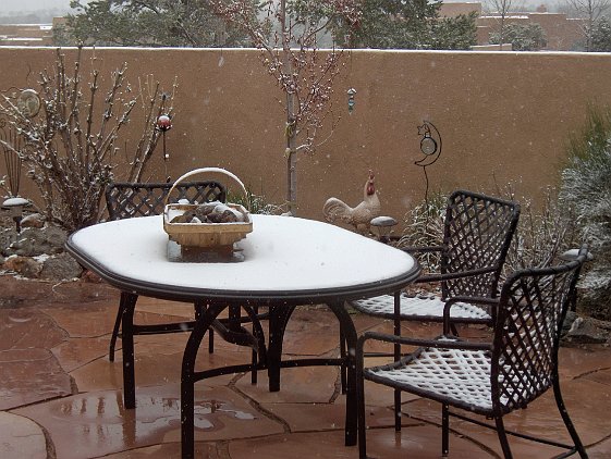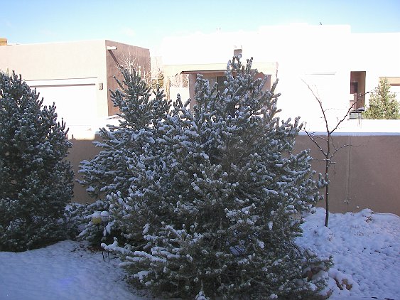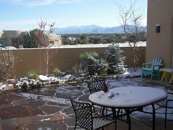 Early in April we were able to get out on the trails that surround Rancho Viejo. Great sunset. Taken from one of the trails. Kate was our first guest in our new home. As part of the tour we gave her, we drove to Chimayo', one of the places we like to visit. The trees haven't really started to turn green this early in the month. Have I mentioned that it snows in Santa Fe? Here it is--the middle of April--and it is still snowing. We had guessed that it would be safe to put out the patio funiture, but we were too optimistic. We went to a kiln opening in Madrid--just a few miles away. We got there shortly after the artists broke it open. This was a communal effort by the artists. Some results were better than others... We liked this piece. Here are pictures of the house taken when we made a visit to do an inspection in mid-November, 2007Some pictures of how the house looks in June