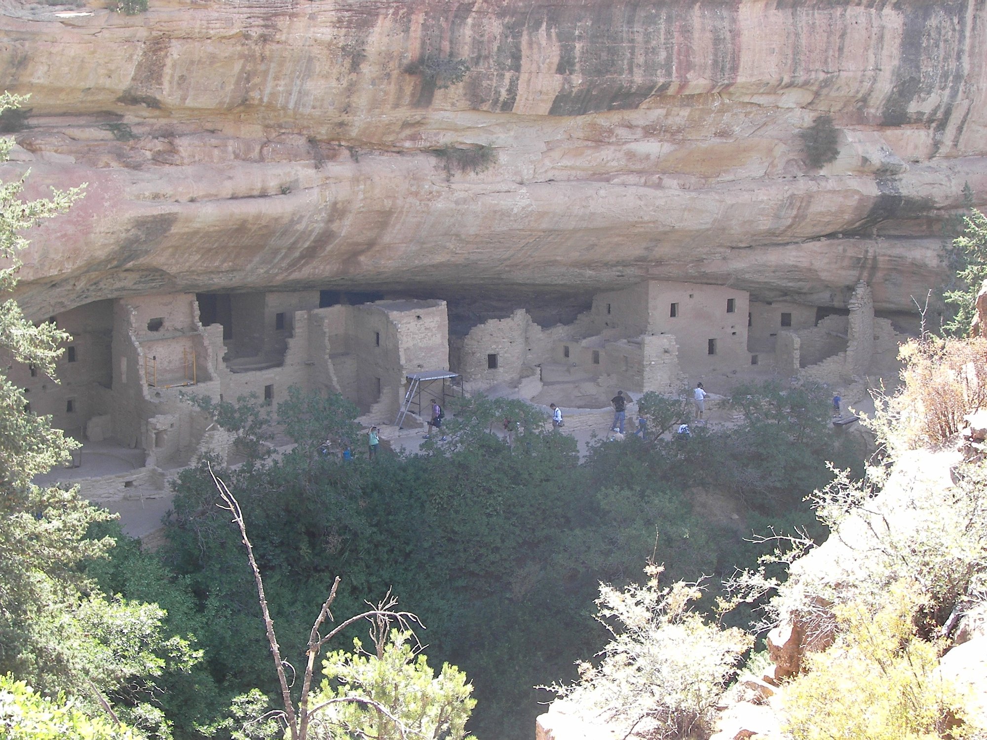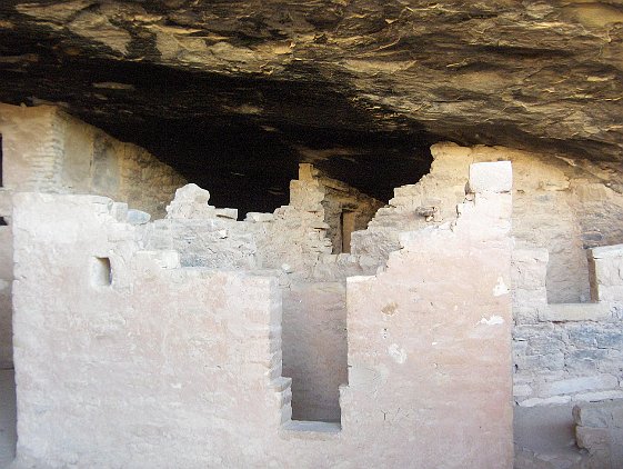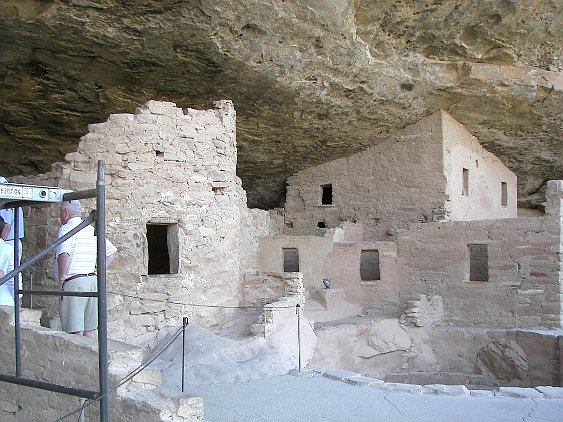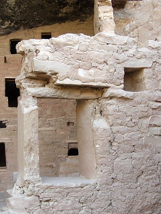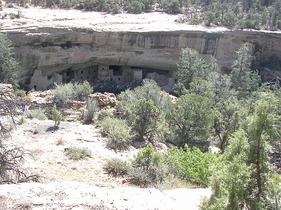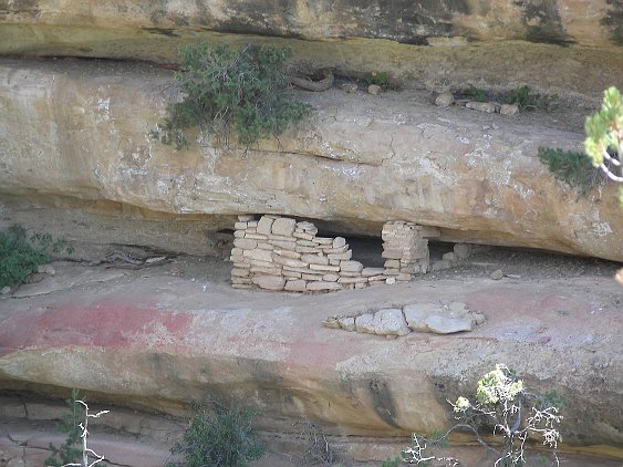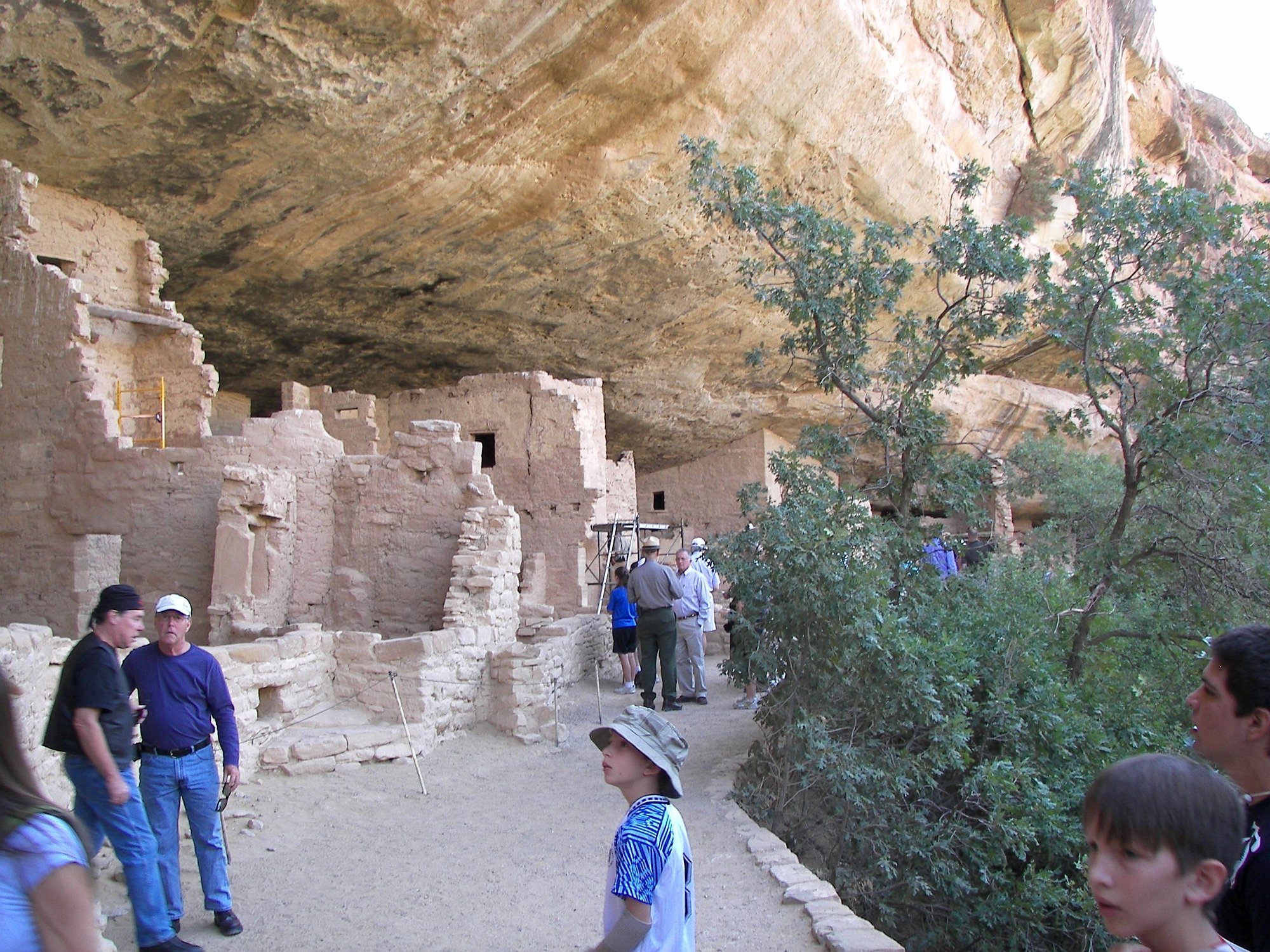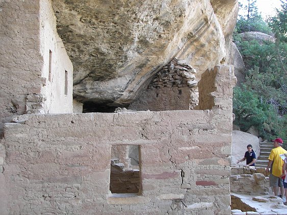 As part of our 40th anniversary weekend we made our first visit to Mesa Verde. Look here for more information about Mesa Verde Spruce Tree House from the path walking down. I wanted to show how well it seems to be hidden. Spruce Tree house ruins with some idea of size. Under the overhang, in front of Spruce Tree house. As you can see, it is really several buildings. Not constructed by amatuers. Look at the nice fitting curve. These walls almost look as if they grew in place. Note the blackened ceiling or overhang. The door shapes are distinctive. There are multiple depths as well as multiple stories. Close neighbors Multi-story dwellings; I brightened this picture so you could see that there are a series of rooms going back. Look at the close fit at the top. A fairly large kiva The walls all seem to be smooth on the outside and layered evenly. Matates and grinding stones Grinding a significant amount of grain must have been a lot of work. Another view of the kiva Walking back up the path from Spruce Tree House to the museum The top rock looks like some sort of animal head I spotted this across the way. It is some distance from the main ruin.