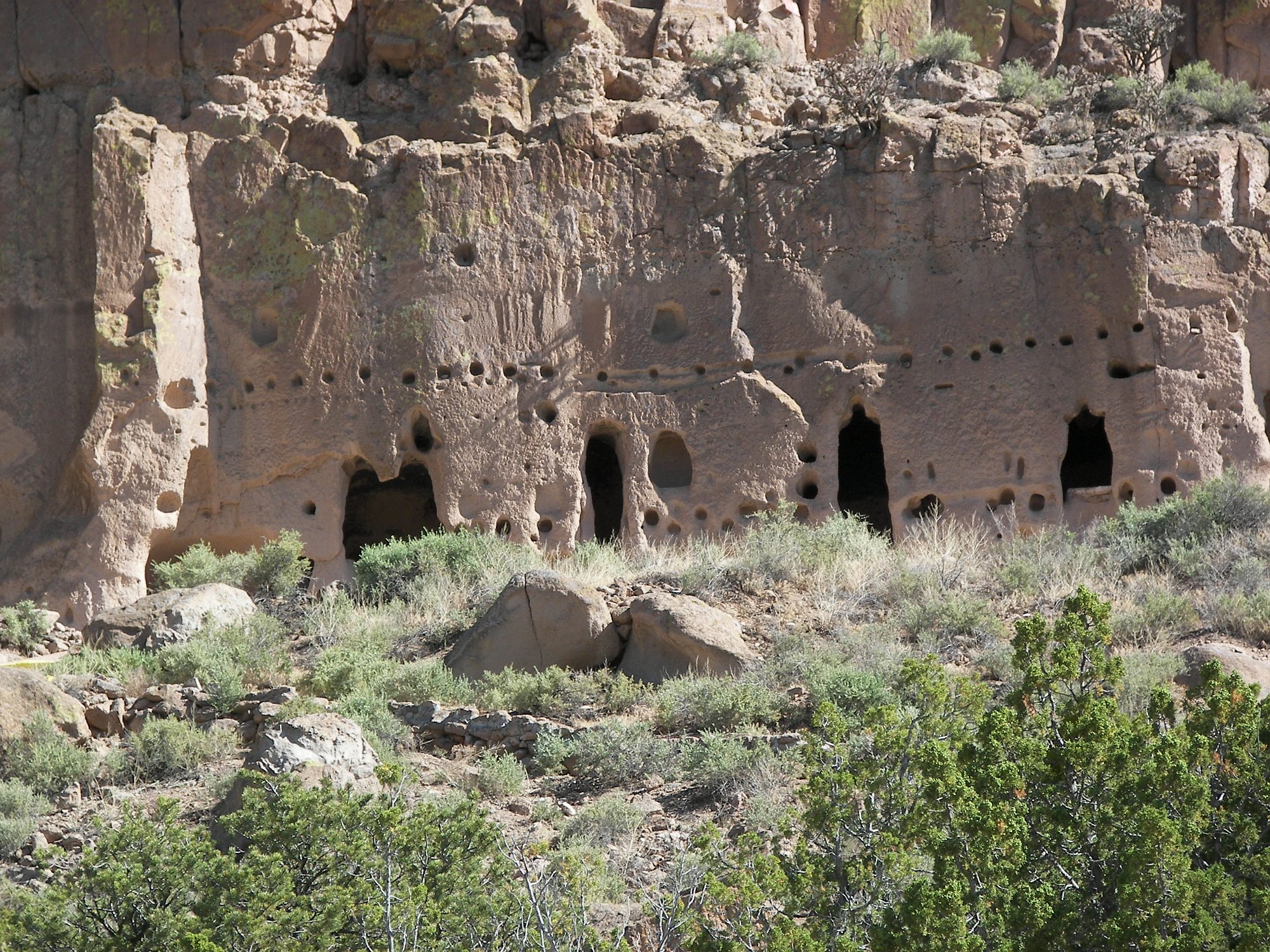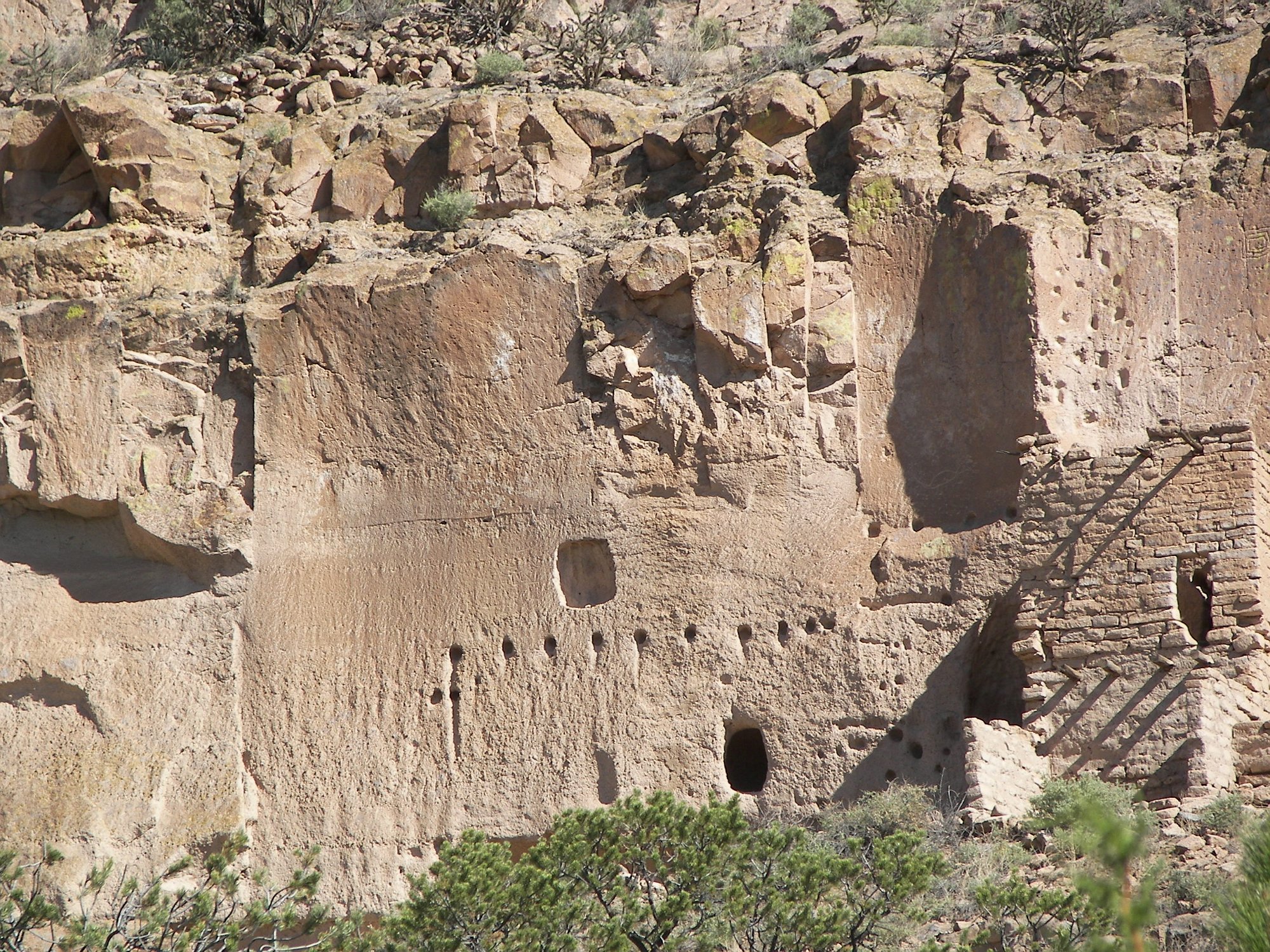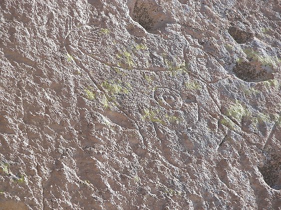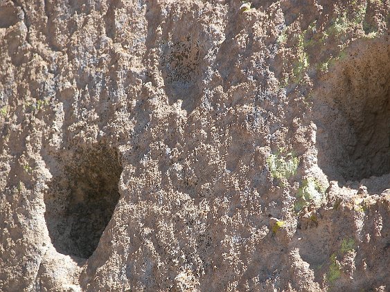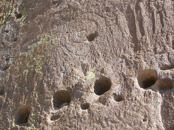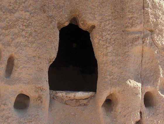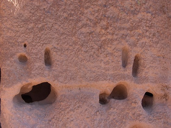 Note the holes for the viga beams that made up the floors and roofs of the dwellings. Just above, note the pictograph. It looks high up, but in fact someone…