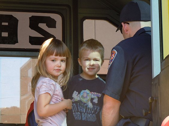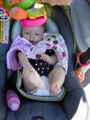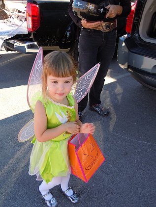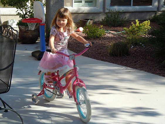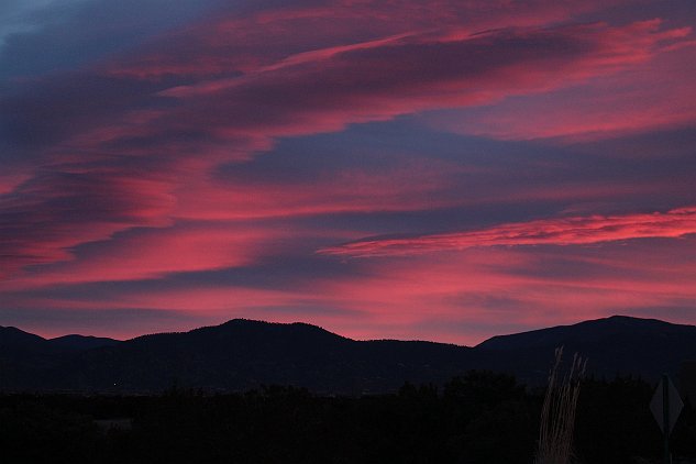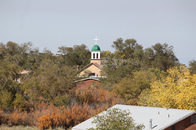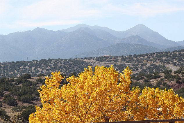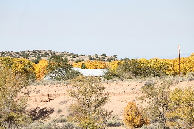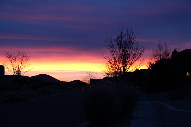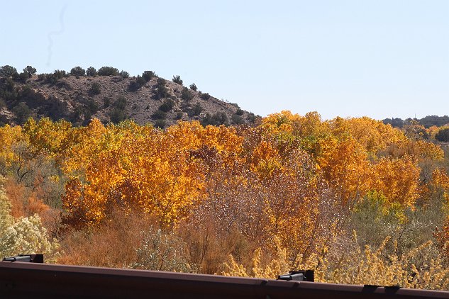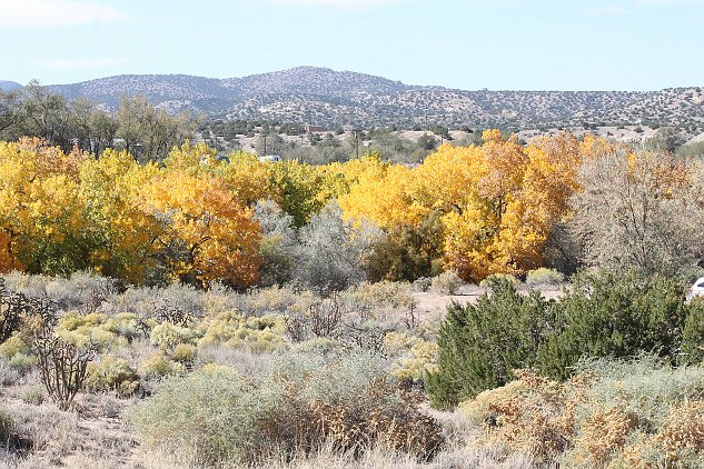 In the Fall, depending on the weather, the cottonwoods by Cerillos may chnage to beautiful gold. Standing by the side of Highway 14, we could see expanses of colorful trees. Some of the colors are more vivid than others. Layers of the Cerillos Hills are visible in the background. A small church in Cerillos Orion's Belt; an experiment while waiting for a meteor shower that never showed up. Abby is behind the trick or treat bag There she is! She is costumed as Tinkerbell. Claire did not have a costume at Halloween. Happy Claire Claire Abby at a fire/rescue demonstration. Bicycling in the back yard. Kate gave her a helmet just after this. There's the helmet. Abby wore it around for a while. First picture of Claire with her new glasses. We went to Phoenix for Thanksgiving with Tevya, Joe, and Noah. Table set for Thanksgiving. Early December sunrise in Santa Fe. Early December sunrise in Santa Fe; two minutes after the previous picture. Experimenting with a new camera. Winter light illuminating one of the Peterson Yazzie masks. July August September