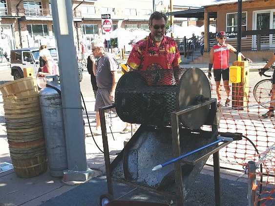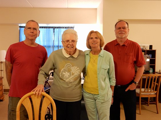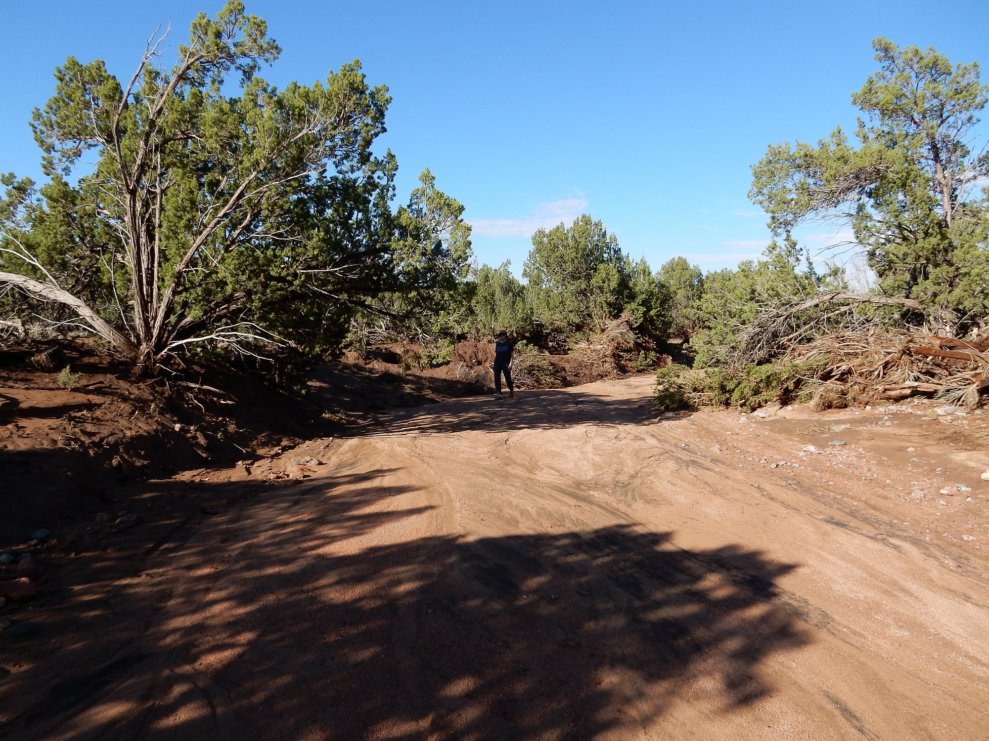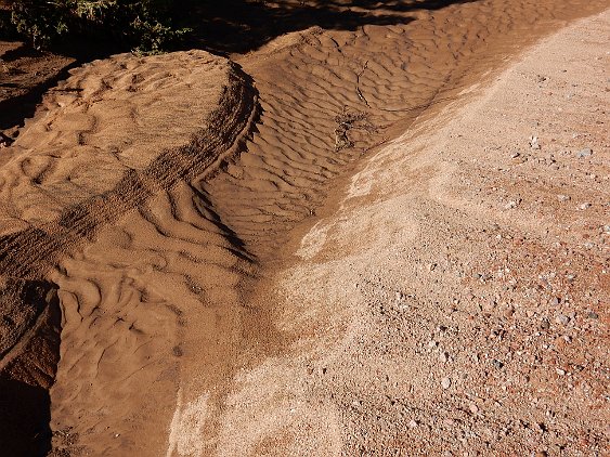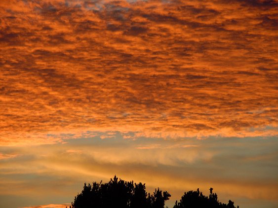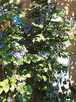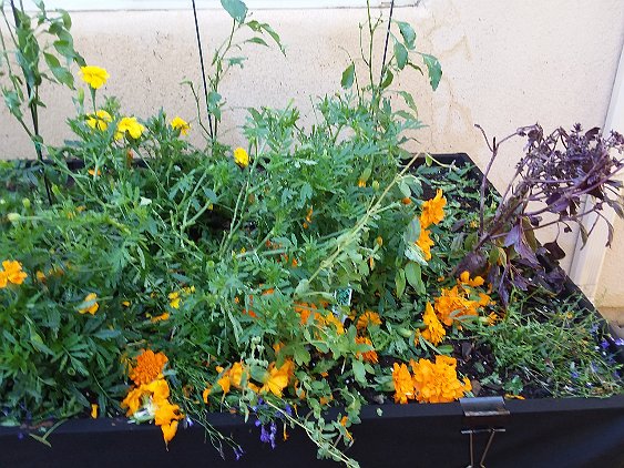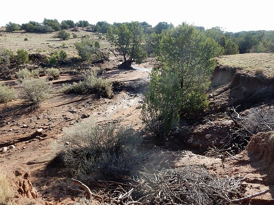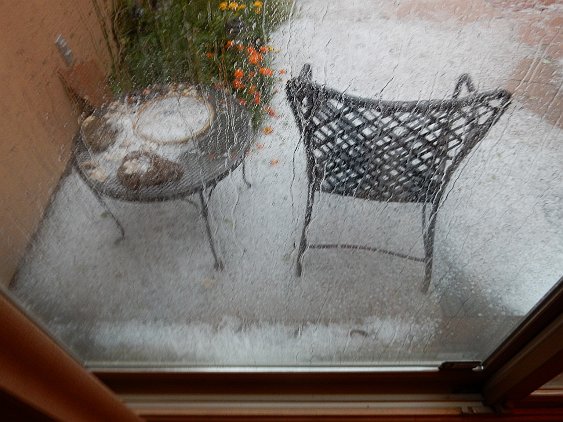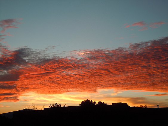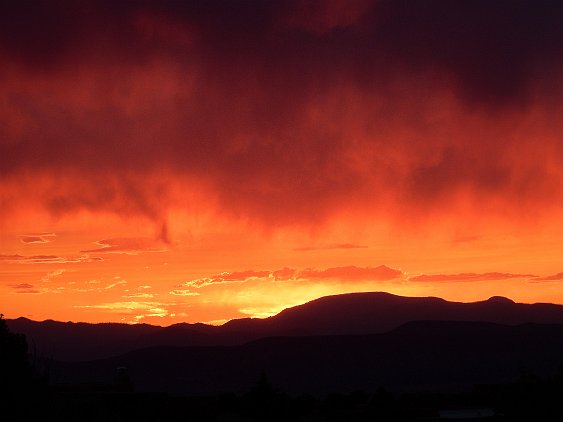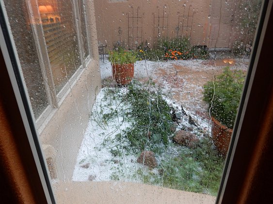July 4th was Patricia's birthday. Early July sunset with virga. Early morning shadows in the courtyard. Not a stick, but a "walking stick" bug (Phasmatodea) Pretty flowers in the courtyard. We had another hailstorm in July. This one dumped even more water and hail than the one in June. The ice was almost to the top of the step into the house. There was so much rain that the nearby arroyo ran That happens very infrequently. The arroyo was scoured clean and in some places the water reached about 6 feet deep. The water left patterns on the bed of the arroyo. The force of the water damaged these drainpipes (about 5 feet high) and pushed a lot of debris onto the road above. Everything in the planter grew very well. Interesting cloud patterns. I wonder where the red color came from. I took this picture on July 28th. I have no clue what it is. Any ideas? Monsoon-season clouds in August. I visited my mother in Belvidere in August. Mark, my mother, Mary, and me. Mid-August signals chile-roasting time at the Farmers' market and elsewhere in New Mexico. These look like grapes on the wall of the Chez Mamou French Bakery and Cafe in downtown Santa Fe. I wasn't about to try one to find out, though. April May JuneOctober November December