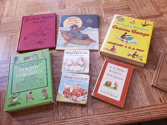 We started doing Facetime reading sessions with Claire and Kate in April. These are some of the books we started with. Now, Claire can read a lot by herself, so…