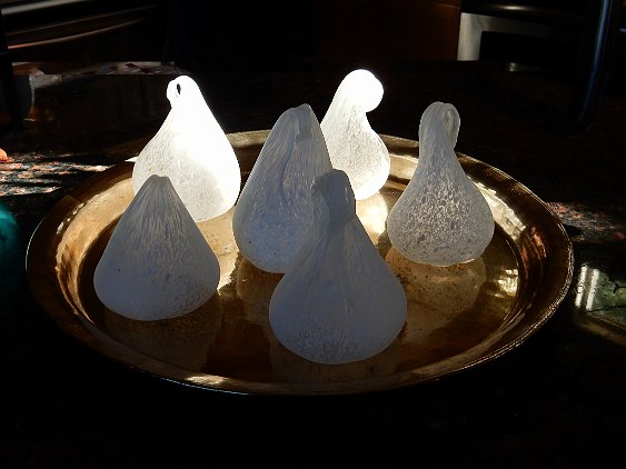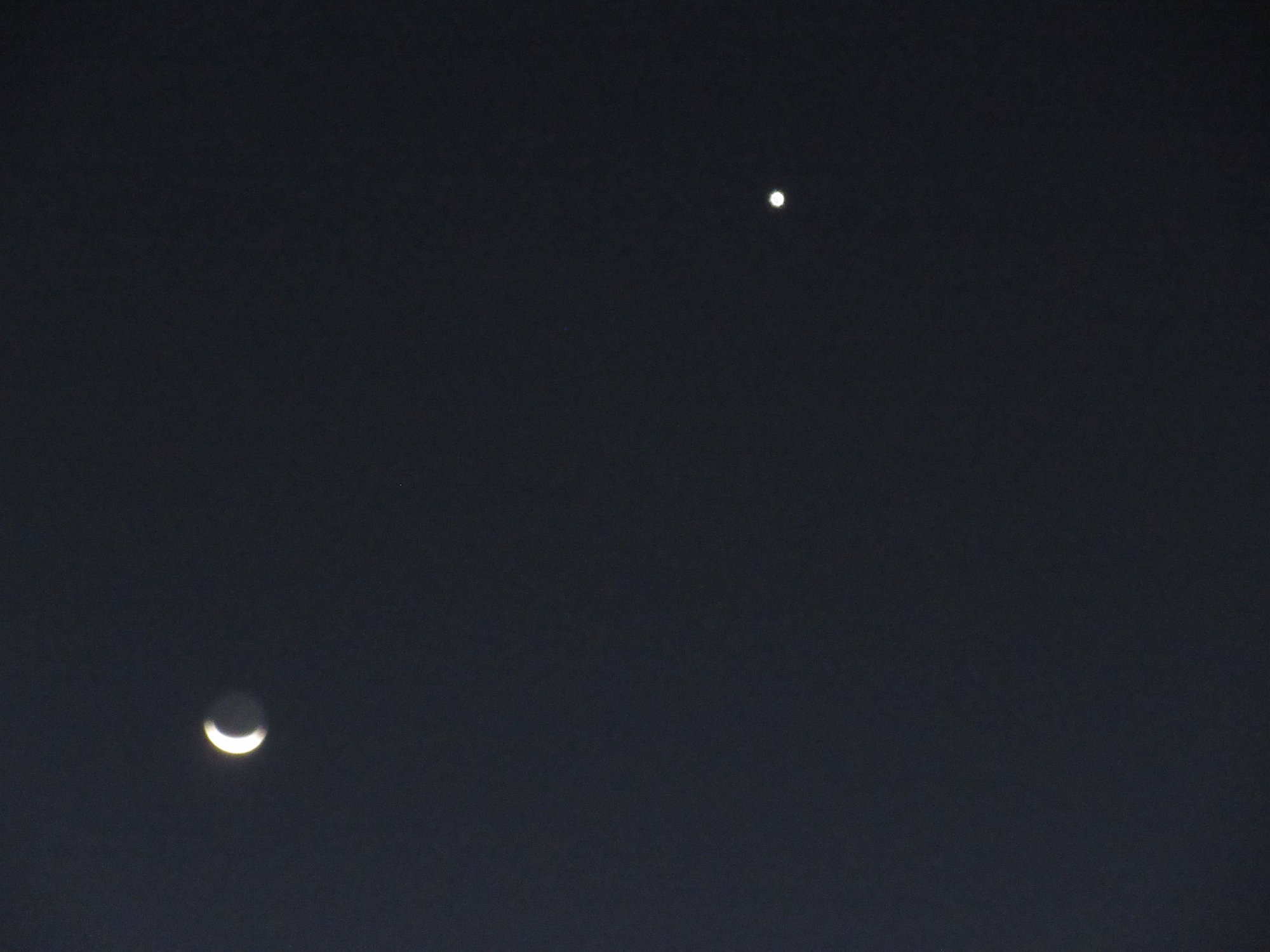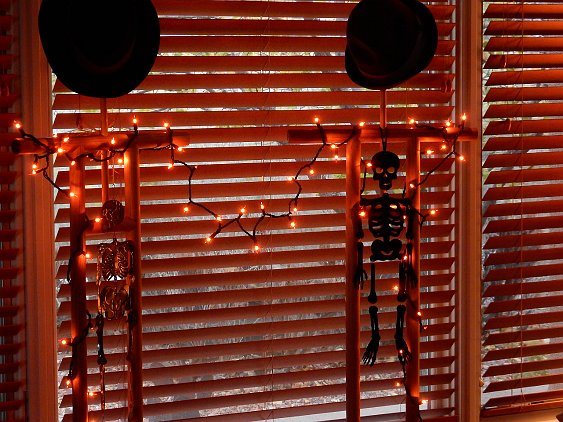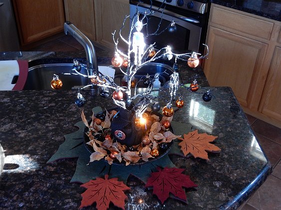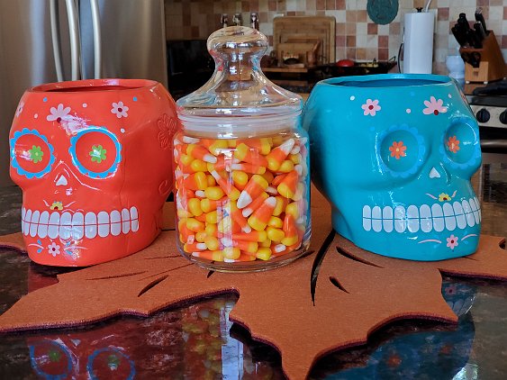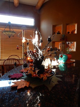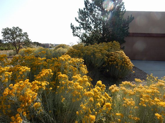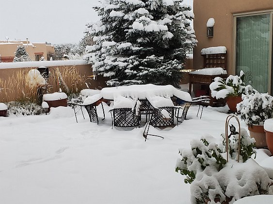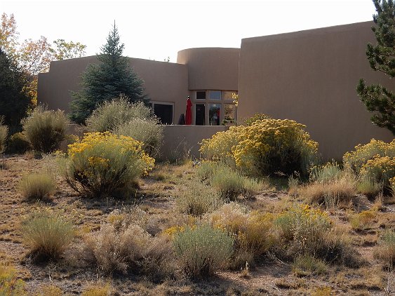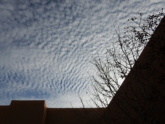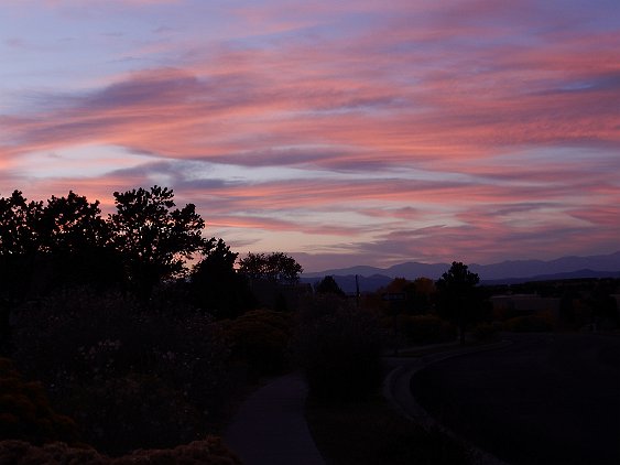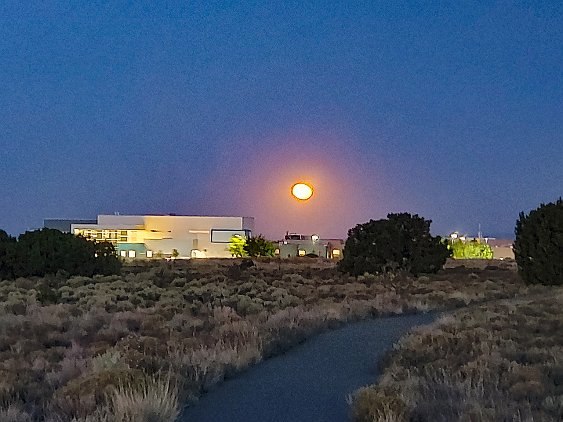 The moon setting over IAIA on October 1st at 0-dark-thirty. The moon was just past full on October 1st. Fall turned the chamisa this vivid color. Chamisa is a member of the sunflower family. Wikipedia article about chamisa Close-up of chamisa The trees are starting to turn yellow, too. Time to start decorating for Halloween. There won't be any trick-or-treaters this year. Fall decorations Fall decorations in the afternoon light. Light and reflections More Halloween decorations. It's getting dark earlier in early October. This doesn't look like much, but Patricia captured Mars (upper right) close to the moon on 4 October. Finally!!! some precipitation on October 27th. How much, you ask... ... about 7 inches, we reply. On October 29th we had a full moon. The afternoon fall light made the glass glow. Halloween decorations The moon was just past full on October 30th. We see some interesting cloud patterns here in Santa Fe, We are in an area where upper level winds often collide from different directions and that may have something to do with this. July August September