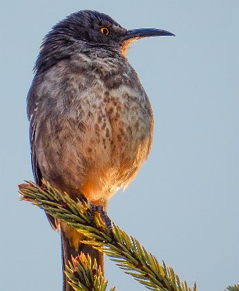 This bird often perches at the highest point on our spruce at sunrise and sunset and loudly declares its territory.